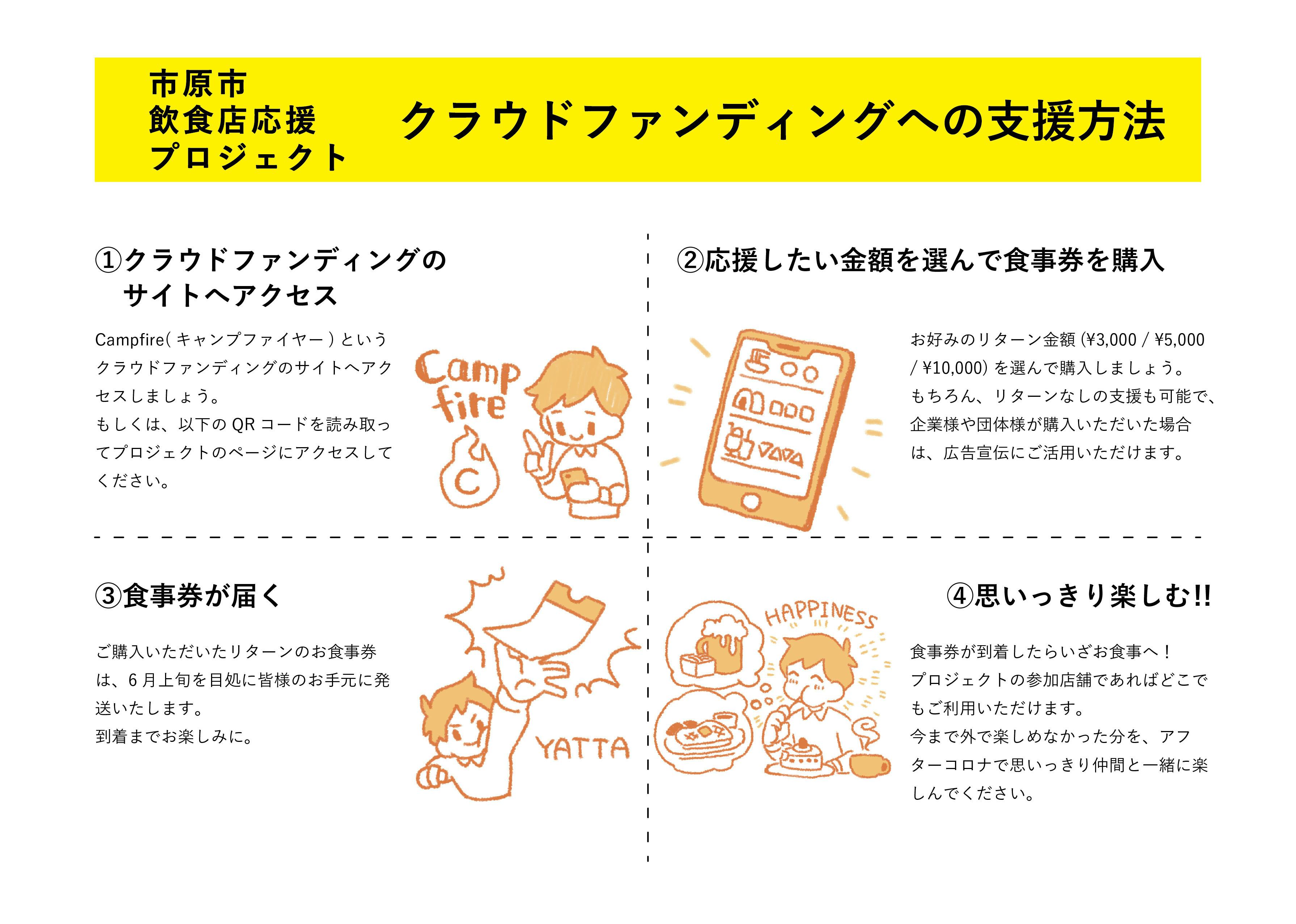 市原市飲食店応援プロジェクト実行委員会では、少しでも早く支援を始めるため、先行で市原市の飲食店でテイクアウトサービスを実施している店舗をマップ化しました。同時に、現在休業している店舗も含めてもっと多くのお店に直接的な支援をしたいと考え、今回のプロジェクトを立ち上げました。