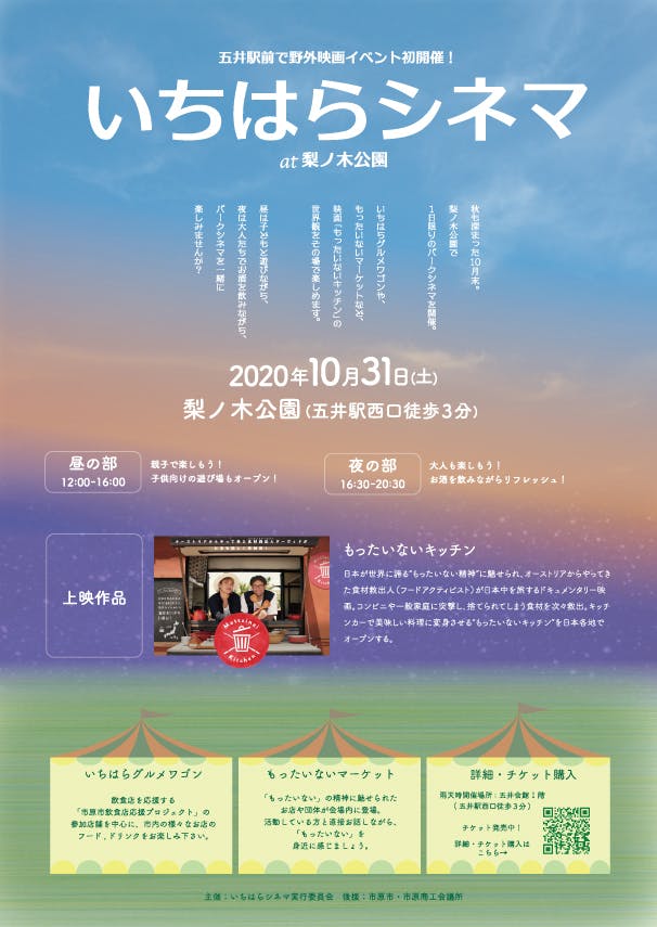 2020/10/21 18:00「市原市飲食店応援プロジェクト」に沢山のご支援を頂き、本当にありがとうございました!私たちのように、コロナで苦しむ飲食店や街を応援するプロジェクト・クラウドファンディングは全国各地で行なわれてきました。しかし、私たちはまだ終わりません。「応援プロジェクト」でつながった20・30代の仲間たちが新たな企画を水面下で進めていました・・・!その名も・・・「いちはらシネマ」五井駅前の芝生の公園で、野外映画祭を行ないます!「応援プロジェクト」にご参加頂いたお店を中心に、本企画の趣旨に共感頂いた市内の飲食店が五井駅前に集結!お揃いの木製ワゴンで、皆さんに美味しい市原グルメをお届けします!また、今回はただの映画祭ではありません。上映作品は「もったいないキッチン」という映画です。フードロスをテーマに、食や暮らしについて、きっと考えさせられるでしょう。普段はあまり見る機会がない映画かもしれません。しかし、縁あって「飲食店」というキーワードでつながった私たちですから、ぜひ皆さんと一緒にこの映画を見ながら、市原のこれからを、私たちの暮らし方を考えられればと思っています!そして、映画のような取り組みは、実は私たちの地元・市原でも少しずつ始まっています。「もったいない」をキーワードに、共感した団体や事業者が会場内にブース出展!牛乳パック等のいらなくなったものでクラフトを作ってみたり、不要な洋服の物々交換を体験したり、美味しい野菜を育てている農家さんと繋がったり・・・「もったいないマーケット」と称して、皆さんにぜひ知って頂きたい取り組みをラインナップしました!昼夜二部制ですので、ご都合の良い時間にご参加下さい!詳細とチケットは以下サイトからお申し込みください!http://ptix.at/tXILY0皆様のご参加、お待ちしております!!当日会場でお話しましょう! もっと見る