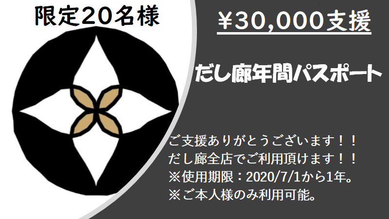 しかし、昨今の新型コロナウイルスの影響により様々な飲食店はもとより、だし廊も危機的な状況に置かれております。