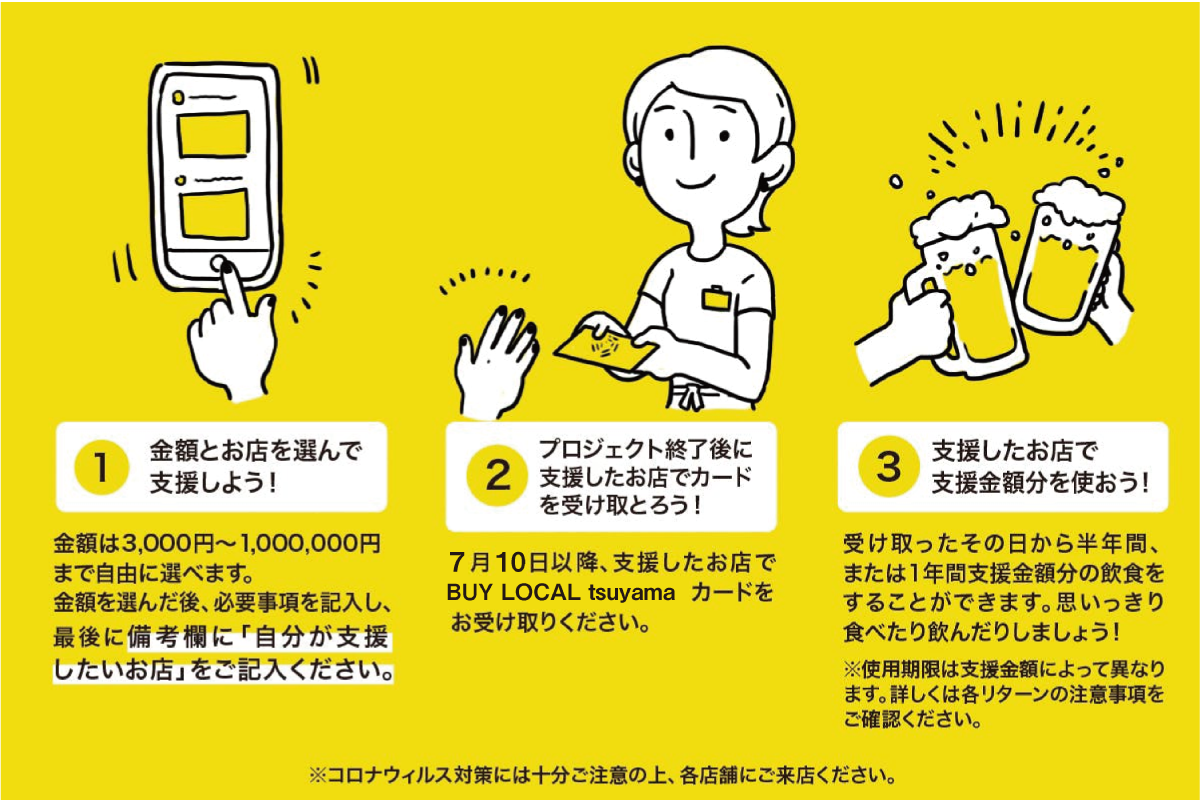 現在、経営を成り立たせることと新型コロナウィルス感染症対策とが両立しないジレンマに商売をされている方が悩み苦しんでいると思います。『BUY LOCAL tsuyama』プロジェクトは、新型コロナウィルスによる外出の自粛などで、今は行くことができないお気に入りのお店に「落ち着いたら食べに行くからね」の応援の気持ちをこめて「未来のお食事券」を先に購入するものです。行きつけのお店や応援したいお店に飲食代金を先払いし、今は行きたいけどここを乗り切ってほしいという応援をキャッシュインという形で支援することが出来ます。