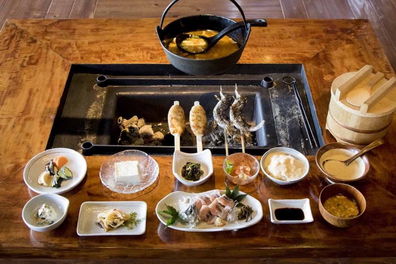 炭火を用いてあまごの塩焼き、五平餅を焼いて、こだわりのお米、手作り豆富、味噌を使ってるお料理をお出しします。店内ガラス張りで田園景色を眺めながらお食事ができます。