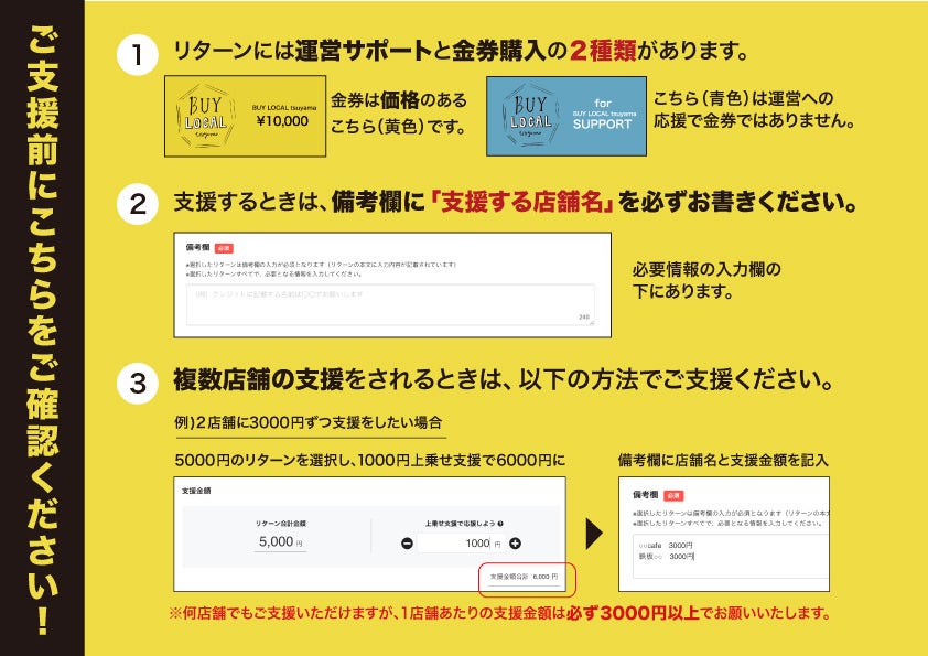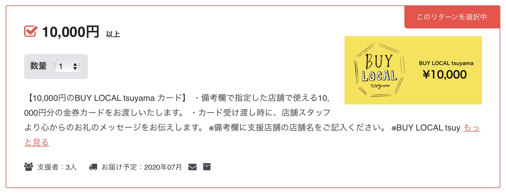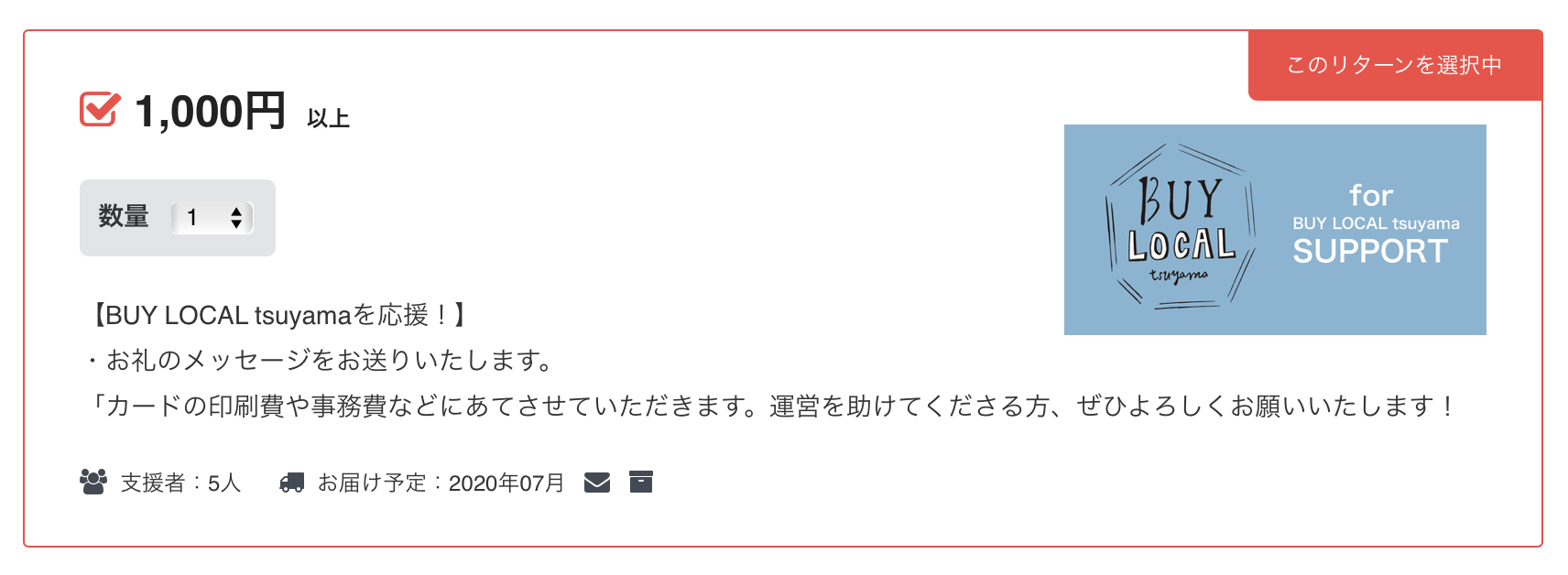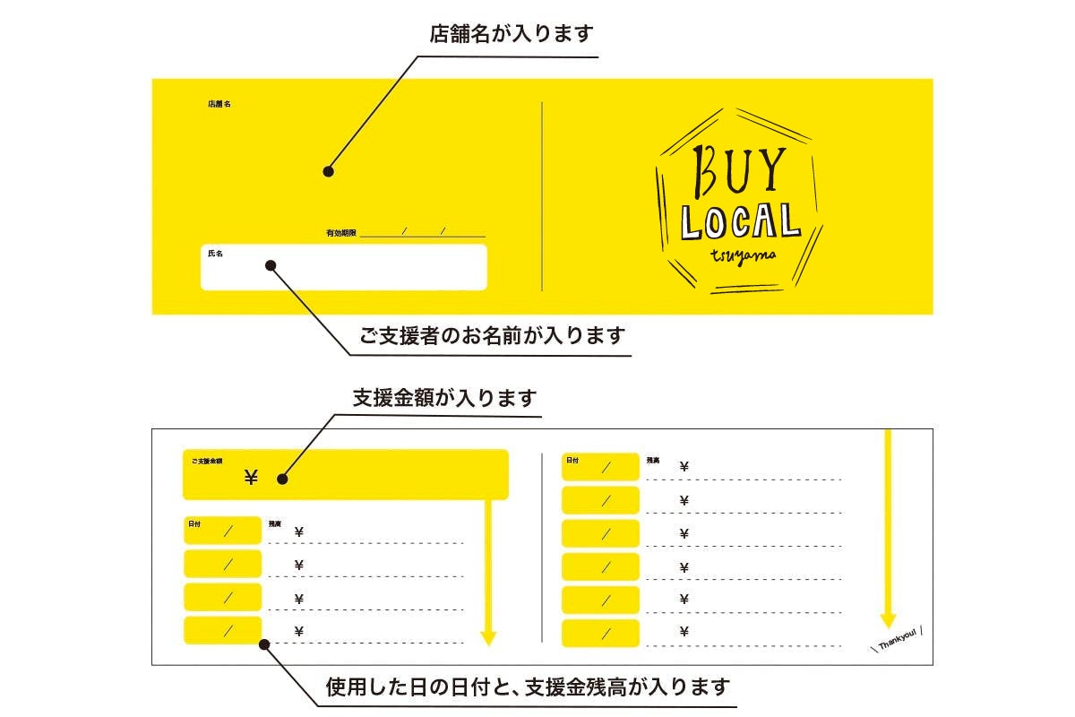 仕組みはとっても簡単。任意の金額のリターンを選び、備考欄に「支援したいお店」を記入して支援すると、その支援金額分使える「BUY LOCAL tsuyama カード」を発行いたします。このカードはプロジェクト終了後に支援したお店で受け取ることができます。
