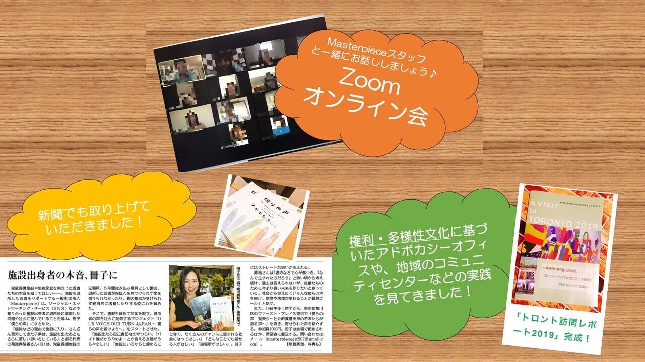 代表まりっぺとMasterpieceボランティアスタッフ(2~3名予定) と30分間zoomでお話しをさせていただきます。社会的養護(親と離れて施設や里親家庭で暮らす子どもたち)に関わるボランティアを始めたきっかけは?など思いを個別に聴くことができます。内容はご希望になるべく沿った形で実施させていただきます。