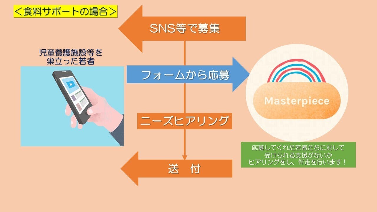 そんな若者からの新規相談が増えています。Masterpieceでは食料サポートと、行政の資源や使えそうな情報の紹介を行っています。