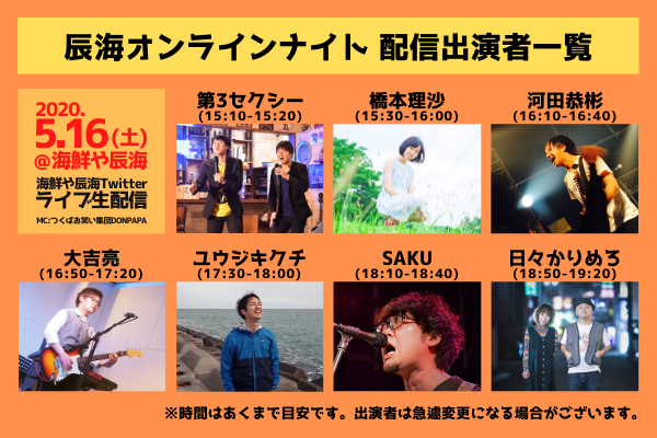 これまで辰海ナイトにご出演いただいた方々による音楽ライブを無料生配信します。