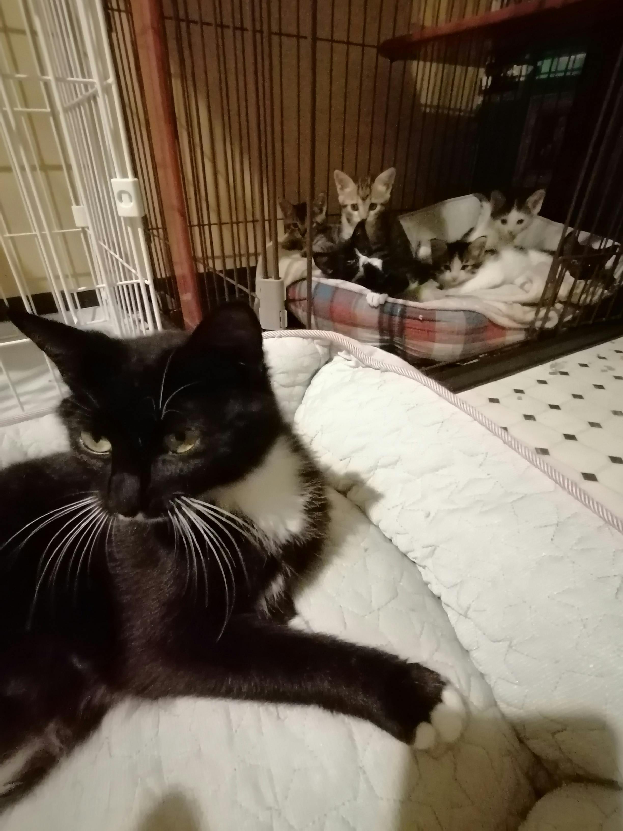 ※5月4日(黒白さん)5月6日(三毛さん)出産しましたが三毛さんは育児放棄の為白黒さんに育ててもらってす!