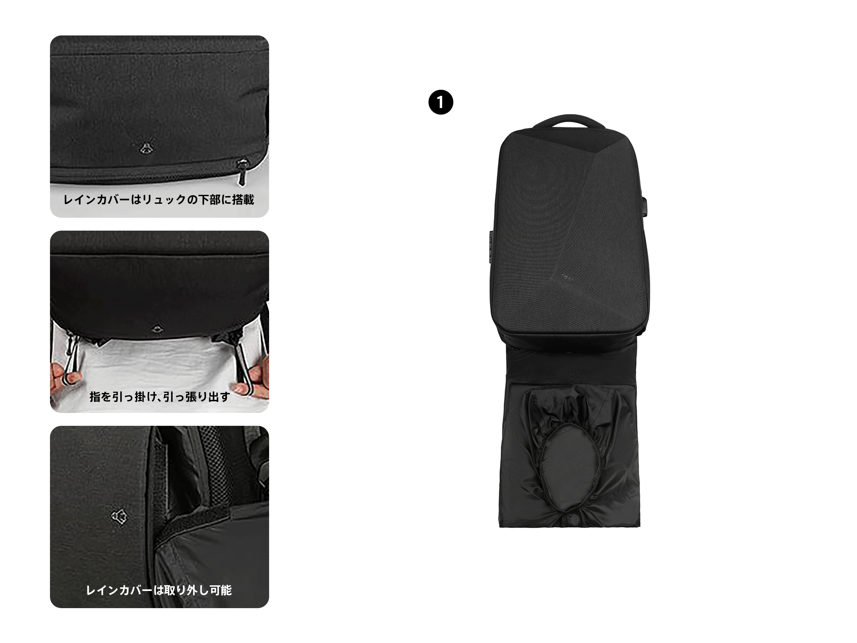 「TOBE万能バックパック」のボトム部分にレインコートを内臓。急な雨でもバッグだけでなく、背負っている貴方ごと守ってくれます。レインコートは分離可能で、雨に濡れた後はしっかり干して乾燥させることで、清潔に利用することができます。