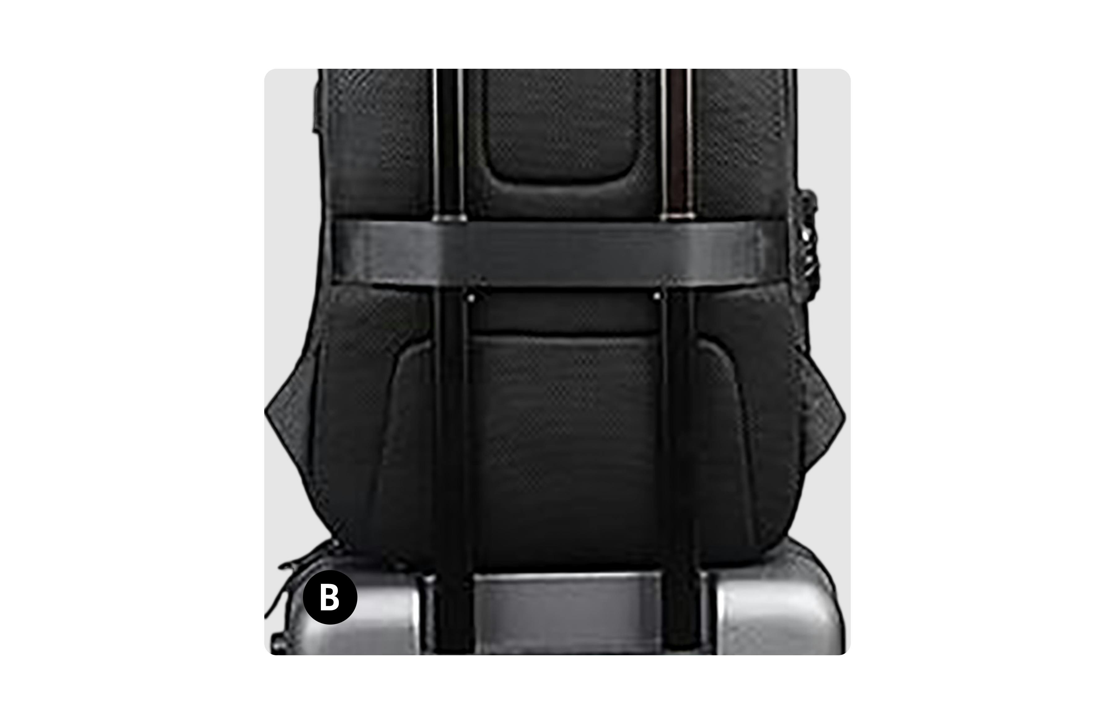 「TOBE万能バックパック」の背面にはキャリーケースベルト を装備、海外旅行など荷物が多いときでもこのように移動が楽になります。
