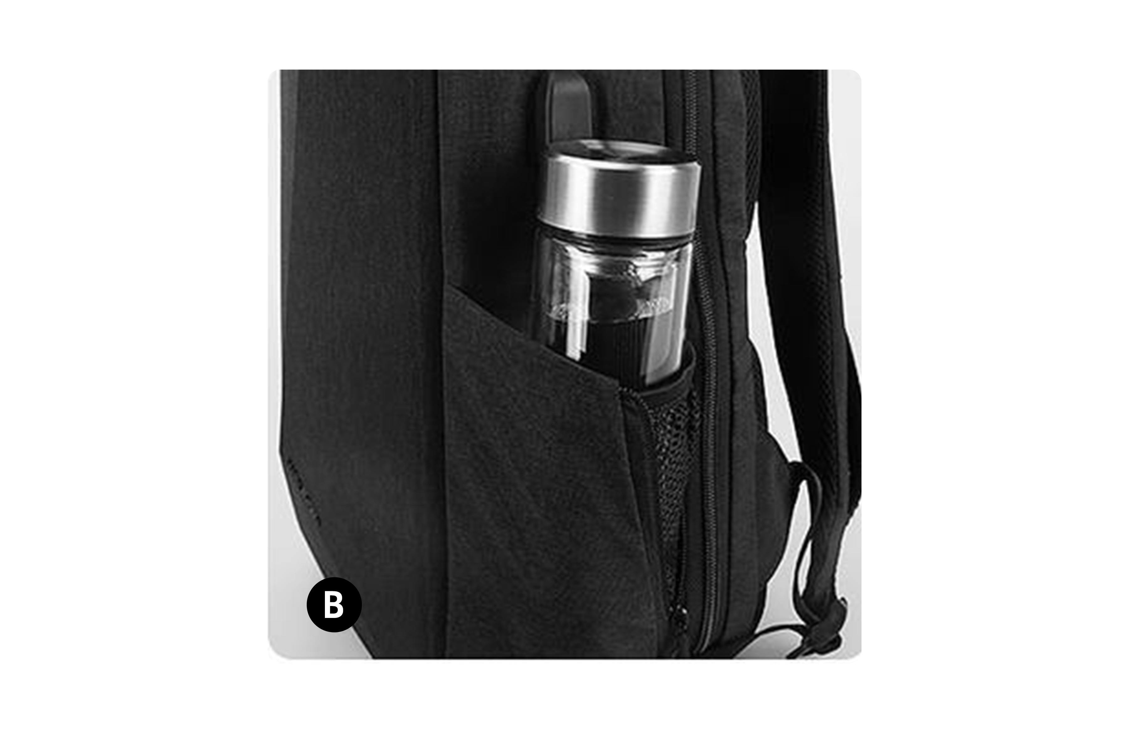 「TOBE万能バックパック」のサイドポケットには、伸縮性のあるポケットホルダー。 防水性の素材を使用しているため、ペットボトルや濡れた折りたたみ傘などが収納できます。