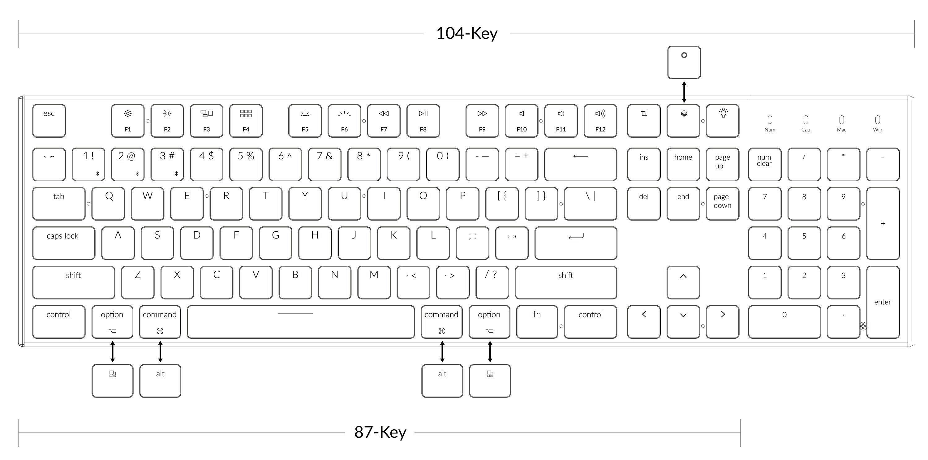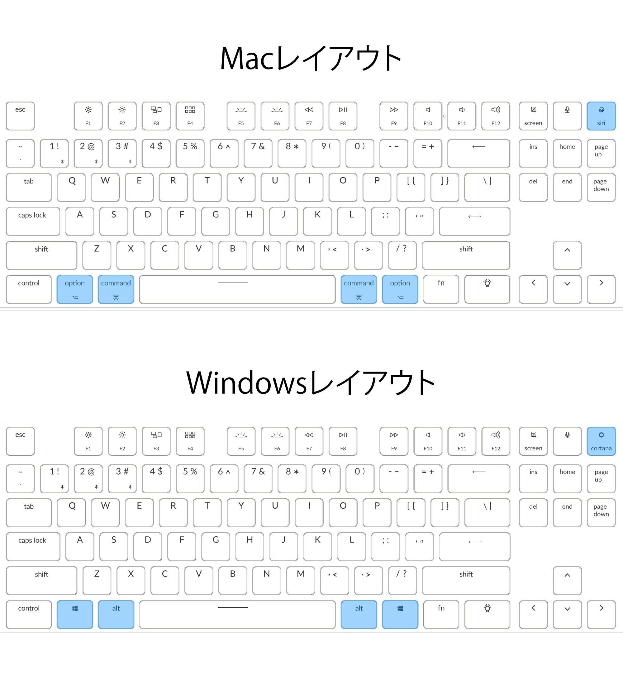 本体スイッチで切り替えられる他、Mac独自の[option],[command],[siri]、Windows独自の[windows],[alt],[coltana]それぞれのキーが同梱されており、自分で付け替えることが可能です。