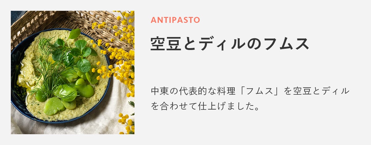 中東の代表的な料理「フムス」を空豆とディルを合わせて仕上げました。