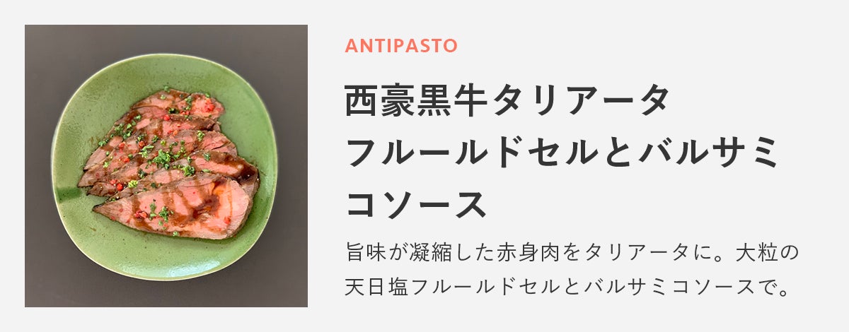 旨味が凝縮した赤身肉をタリアータに。大粒の天日塩フルールドセルとバルサミコソースで。