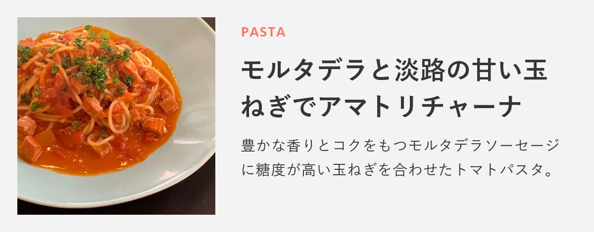 豊かな香りとコクをもつモルタデラソーセージに糖度が高い玉ねぎを合わせたトマトパスタ。