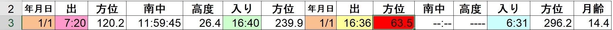拡大した表から、例えば、2018年のスーパームーンは1月1日16時36分に方位63.5から昇り、日の入りが16時40分なので、太陽が沈む4分前に月の出が始まることが分かります。