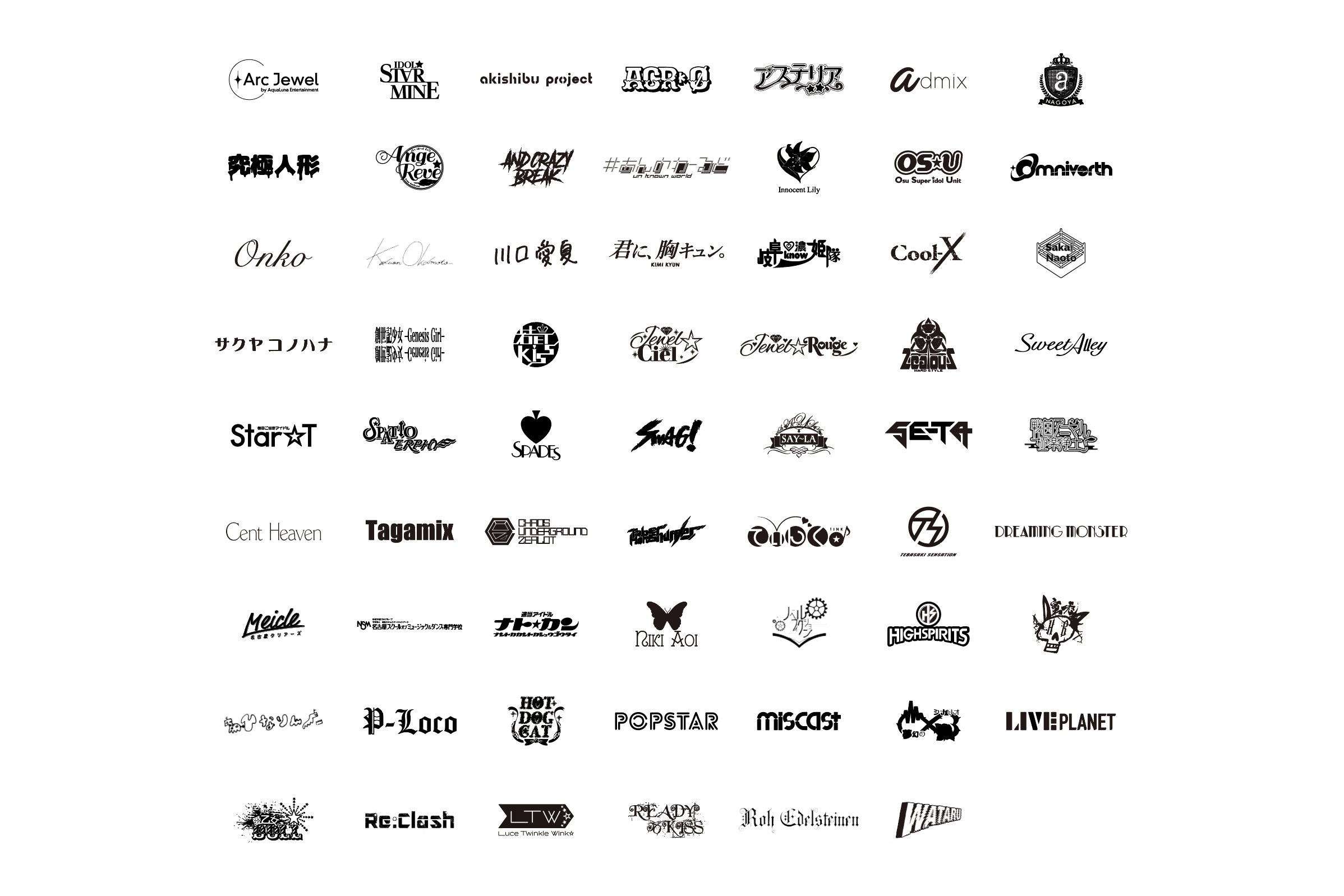 ArcJewel / IDOL☆ST∀R MINE / アキシブproject / ACR*0̸ / アステリア / admix / アモレカリーナ名古屋 / 究極人形 / Ange☆Reve / ANDCRAZY BREAK / #あんのわーるど / イノセントリリー / OS☆U / Onko / KAUAN OKAMOTO / 川口愛夏 / 君に、胸キュン。 / 岐阜♡濃know姫隊 / Cool-X / 酒井直斗 / サクヤコノハナ / 創世記少女-GenesisGirl- / 若ET KISS / Jewel☆Ciel / Jewel☆Neige / Zealouz / Sweet Alley / Star☆T / SPATIO / SPADES / SWAG! / SAY-LA / SE-TA / 戦国アニマル極楽浄土 / Cent Heaven / Tagamix / Chu-Z / Taber / てぃんく♪ / 手羽先センセーション / DREAMING MONSTER / 名古屋 CLEAR'S / 名古屋スクールオブミュージック&ダンス専門学校 / ナト☆カン / 二木蒼生 / ノベルフィクション / HIGH SPIRITS / 蜜兎 / P-Loco / HOT DOG CAT / POP☆STAR / miscast / 夢幻のシナリオ / LIVE PLANET / 愛乙女☆DOLL / Re:Clash / Luce Twinkle Wink / READY TO KISS / Roh Edelsteinen / 𝐖 𝐀 𝐓 𝐀 𝐑 𝐔