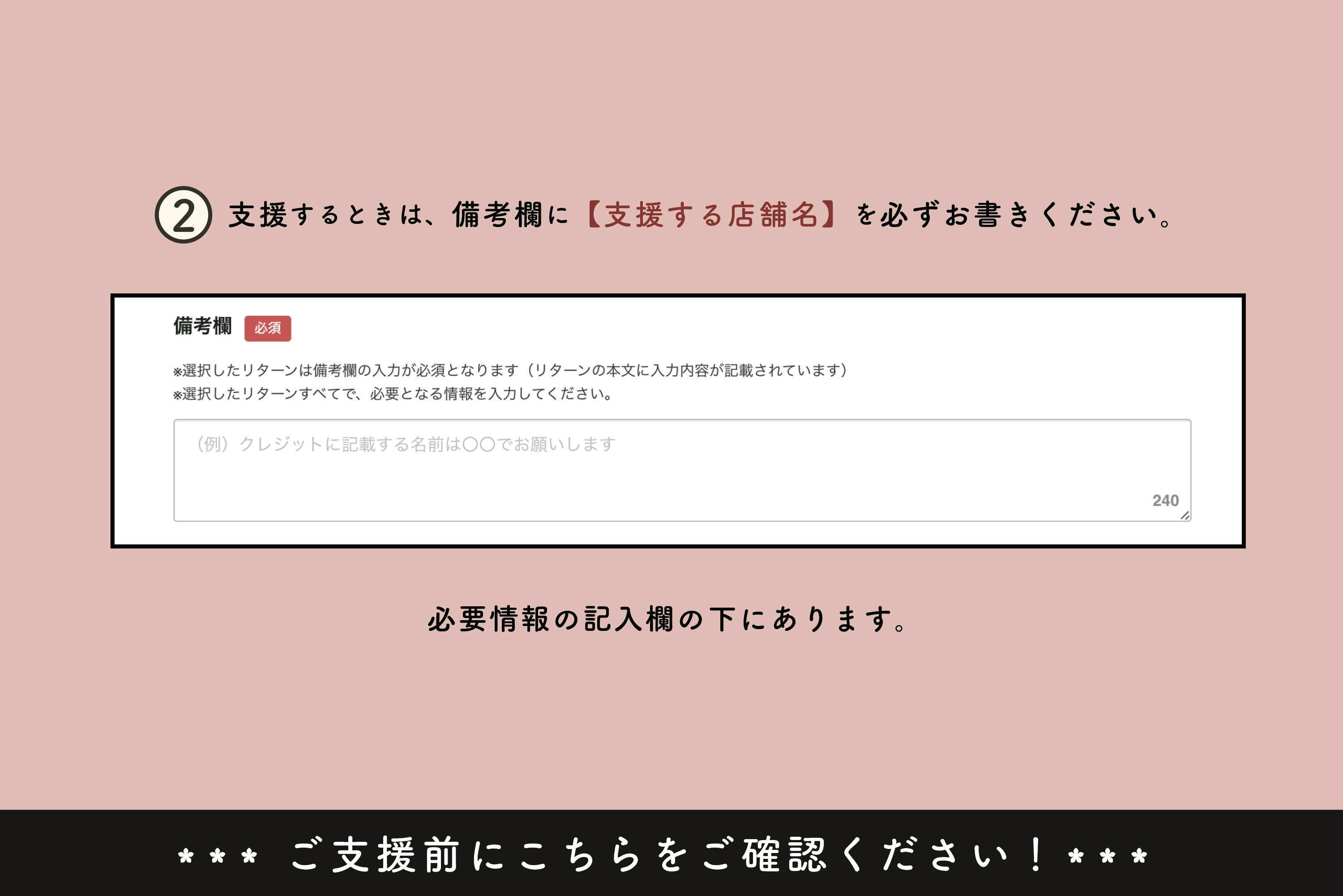 *掲載店舗と支援者の間にトラブルが発生した場合、主催者は責任を負いかねますのでご了承ください。