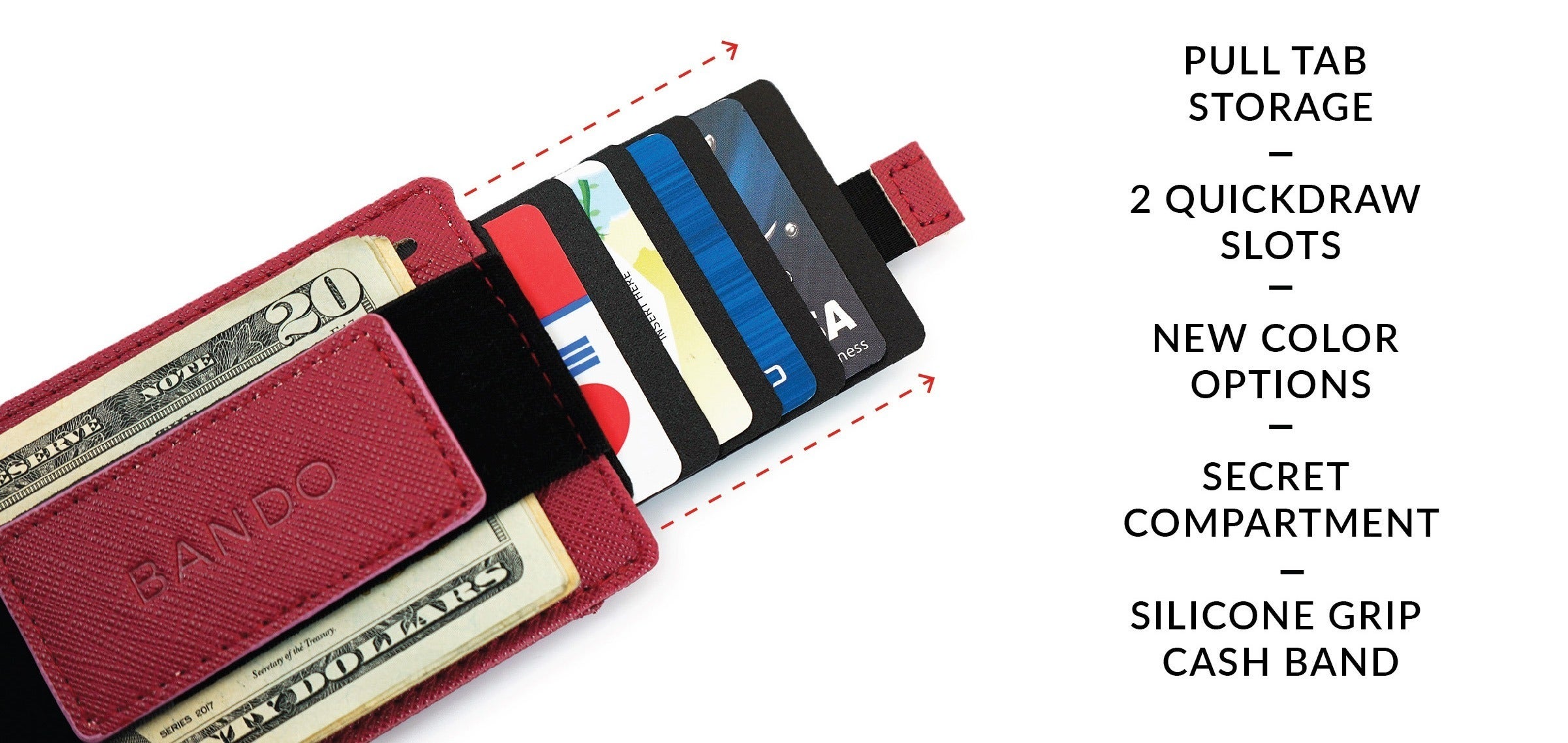 BANDO2.0ではバンドに改良を加えバンド裏側に滑り止めのシリコンビーズを施しました。少ない枚数の紙幣もしっかりと挟むことができます。