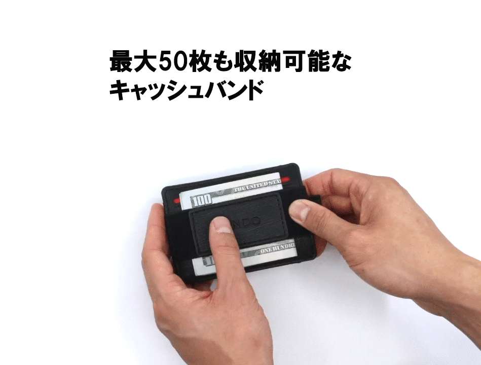 BANDO2.0スリムな見た目からは想像できない収納力を持っています。カードは最大10枚、紙幣は最大50枚も収納可能です。ウォレットが薄くなったからといって普段持ち歩いてるカードを減らす必要はありません。また、カードも紙幣も素早く取り出せる設計になっています。いちいちウォレットを開く必要もなくスマートなお会計が可能に。