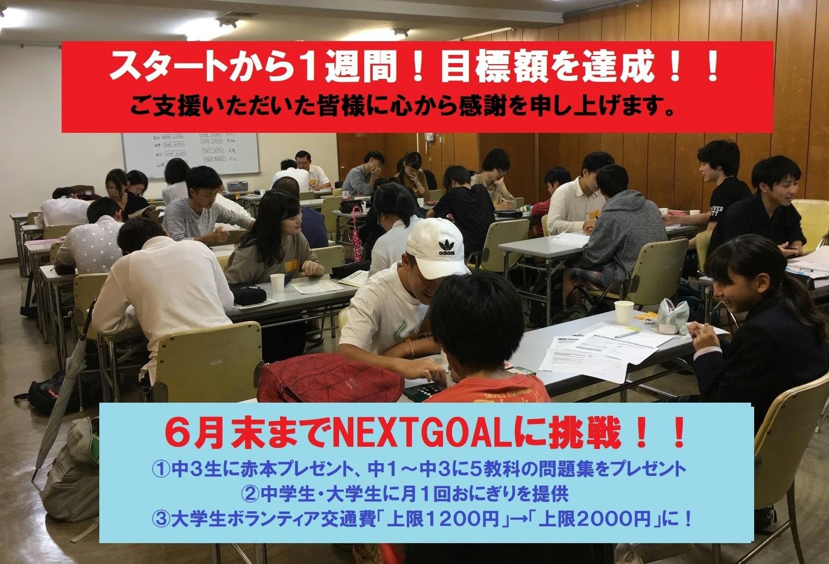 2020/05/16 19:535/8よりスタートをさせていただきましたクラウドファンディングですが、多くの皆さまにご支援をいただき、1週間で目標額を達成することができました!!ご支援をいただきました皆さまに改めて感謝を申し上げます。まだ募集終了まで44日残っており、新たに以下の3つの目標を設定し、近日中に「NEXTGOAL」もご紹介をさせていただこうと思っております。6月末までの長期戦ではありますが、引き続きご協力のほどよろしくお願い申し上げます。1.中3生に赤本プレゼント、中1~中3に5教科の問題集(参考書)をプレゼント2.中学生・大学生に月1回おにぎりを提供3.大学生ボランティア交通費「上限1200円」→「上限2000円」に!※詳細は後日公開をされる予定です。 もっと見る