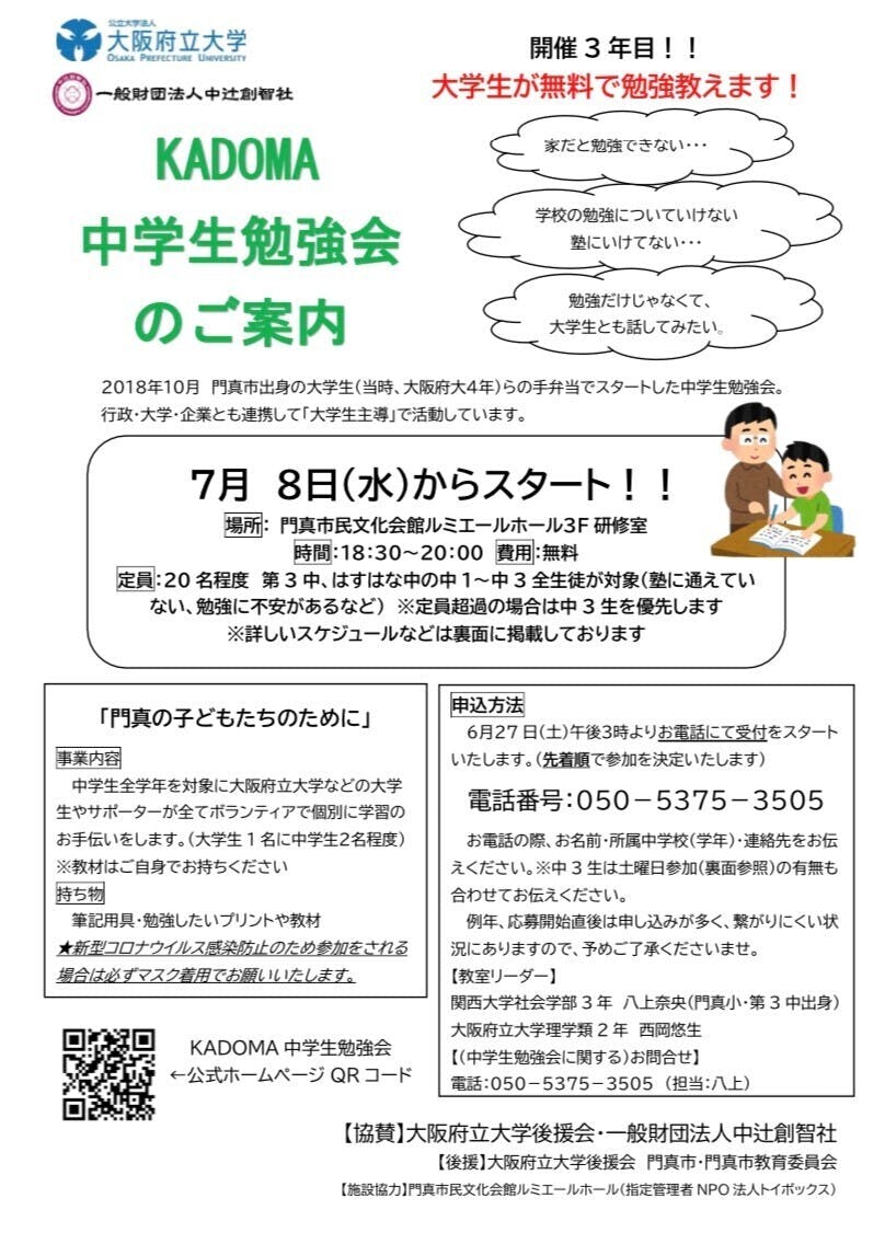 私たちは、大阪府門真市で市内の中学生を対象に無料の居場所・学習支援事業を実施しているKADOMA中学生勉強会です。2018年10月に門真市出身の大学生(当時、大阪府立大学4年)らの手弁当でスタートし、本年3年目を迎えることとなりました。大阪府立大学後援会・門真市・門真市教育委員会にもご後援いただき、行政・大学・企業とも連携をして、運営から企画まですべて「大学生主導」で活動をしてきました。一昨年度、昨年度も市民の方々だけでなく、全国の皆さまからご支援をいただき、何とか活動をさせていただきました。この場をお借りして感謝申し上げます。