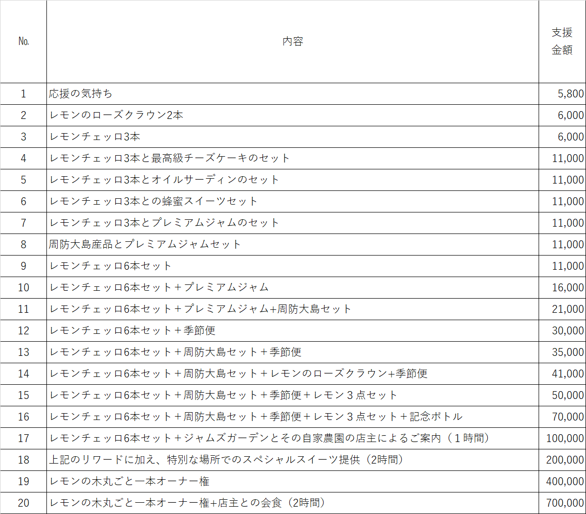今回は、レモンチェッロに加え、周防大島とジャムズガーデンの畑を楽しんで頂くため、様々な産品/体験をリターンに設定いたしました。組み合わせで20通りあります。ページ下部に早見表もご用意いたしました。