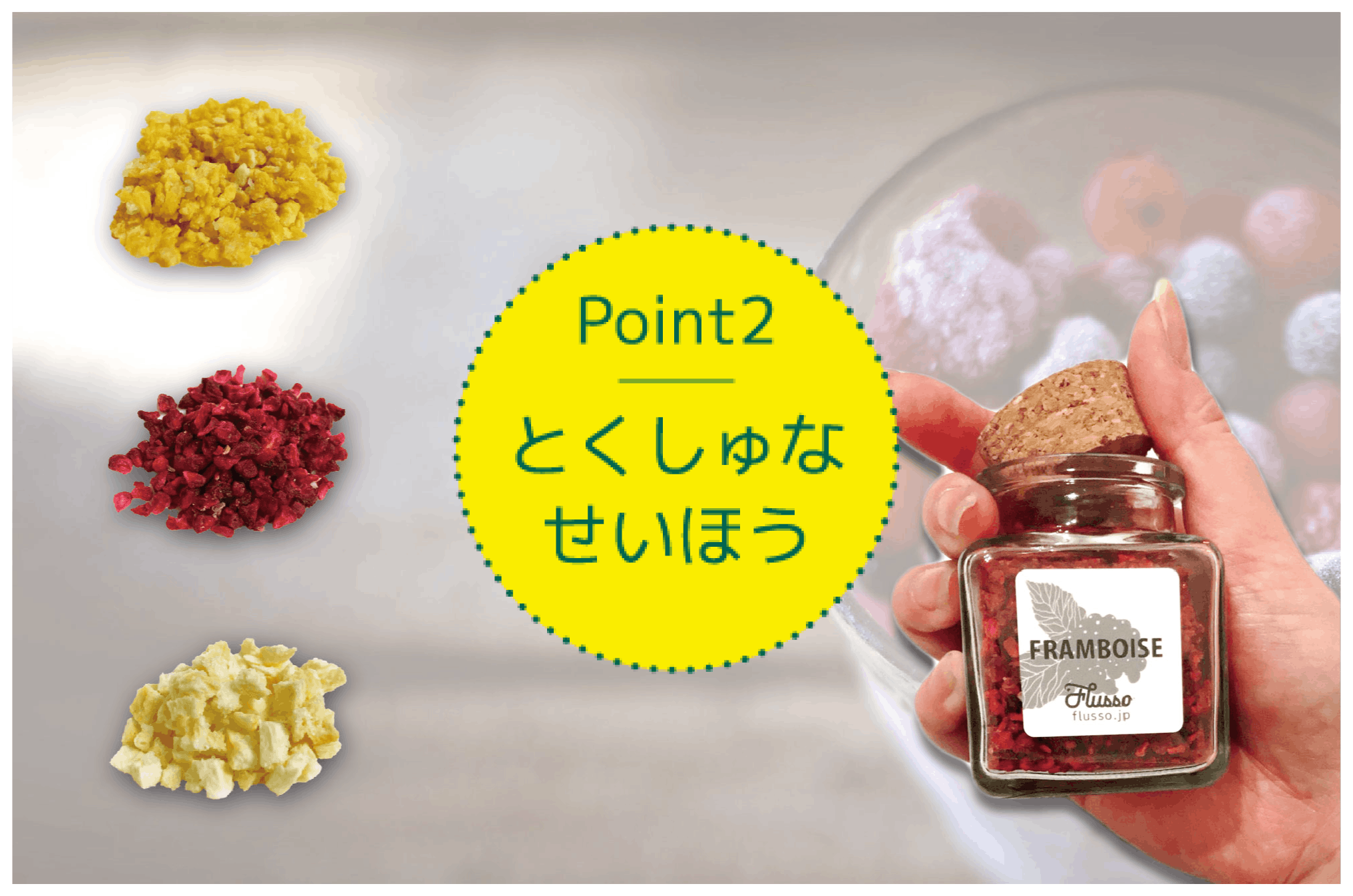 素材の栄養や外観を損なわないフリーズドライ製法は、水分がほとんど抜けることで食感も軽くなり、保存料を一切使わずに長期保存もできる優れた乾燥方法です。