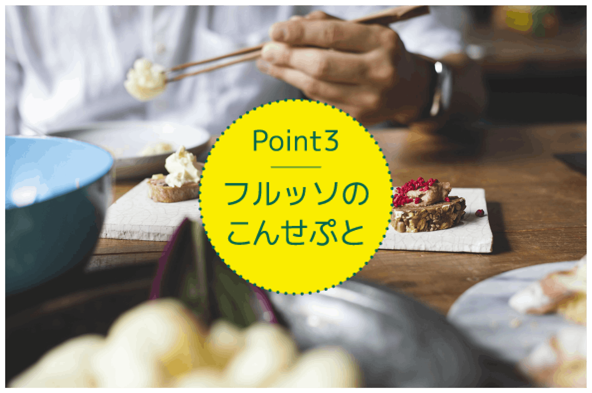 フルッソをかけるだけで、食卓がパッと明るく、華やかに。料理が映えて「これ何々!?」なんて会話も盛り上がります!大切な人と一緒に、フルッソで豊かなひとときを。