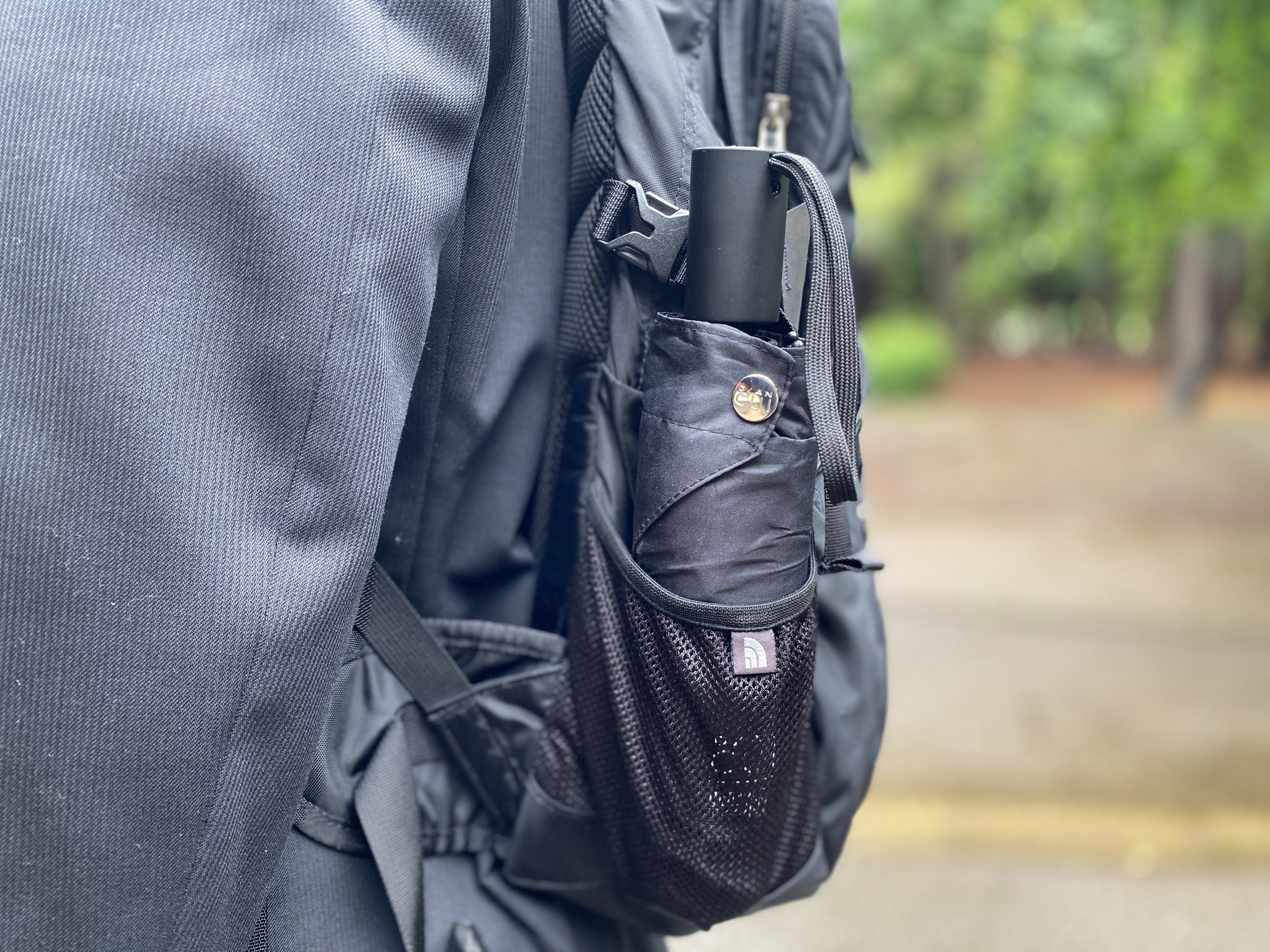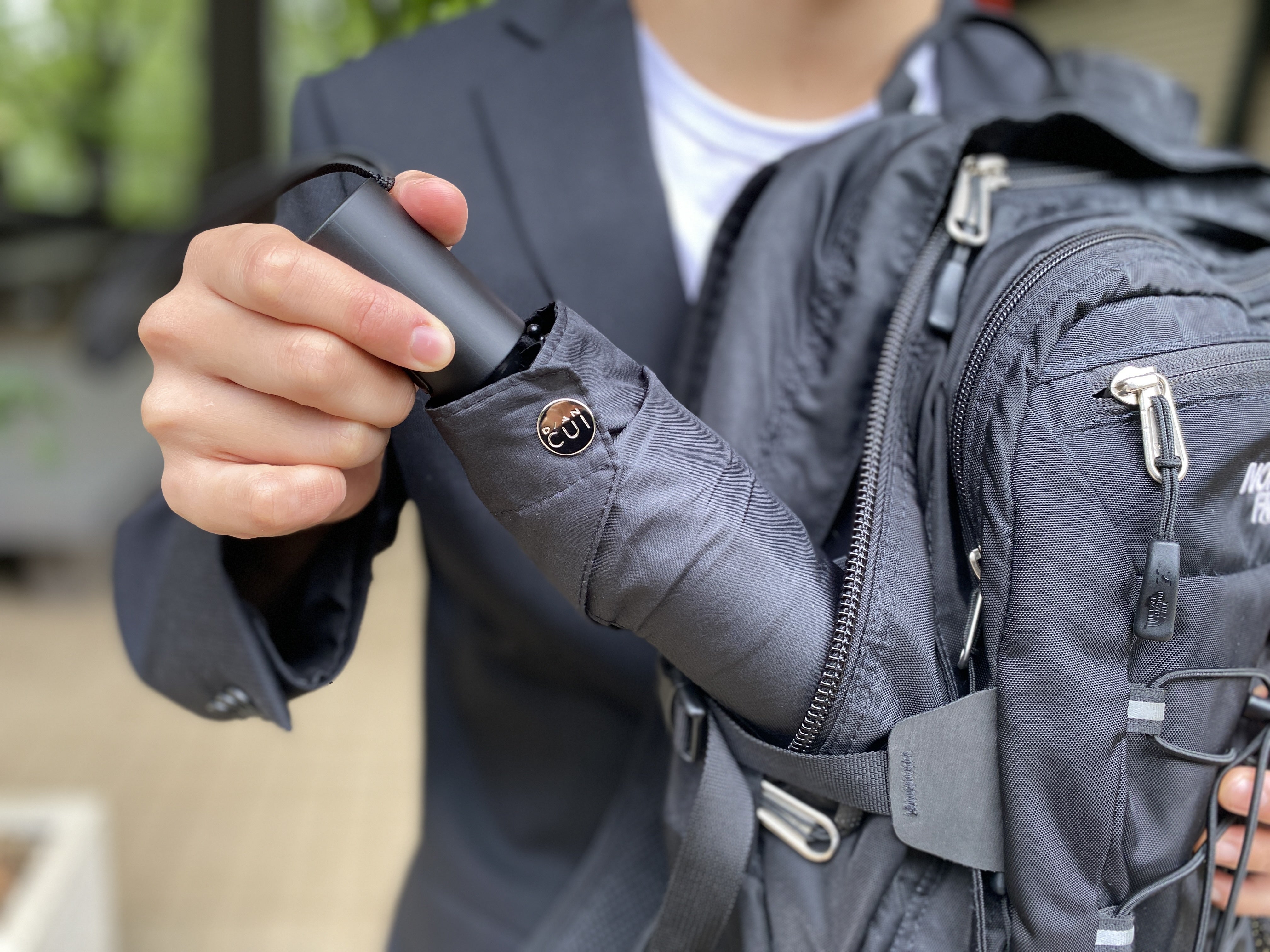 傘布がたるまずにコンパクトにまとまる為、バッグのサイドポケットにも綺麗に収まります。このサイズ感であれば、普段使いのバッグに常に入れておけるほか、職場や学校の置き傘としてロッカーの片隅に置いておくのもオススメです。