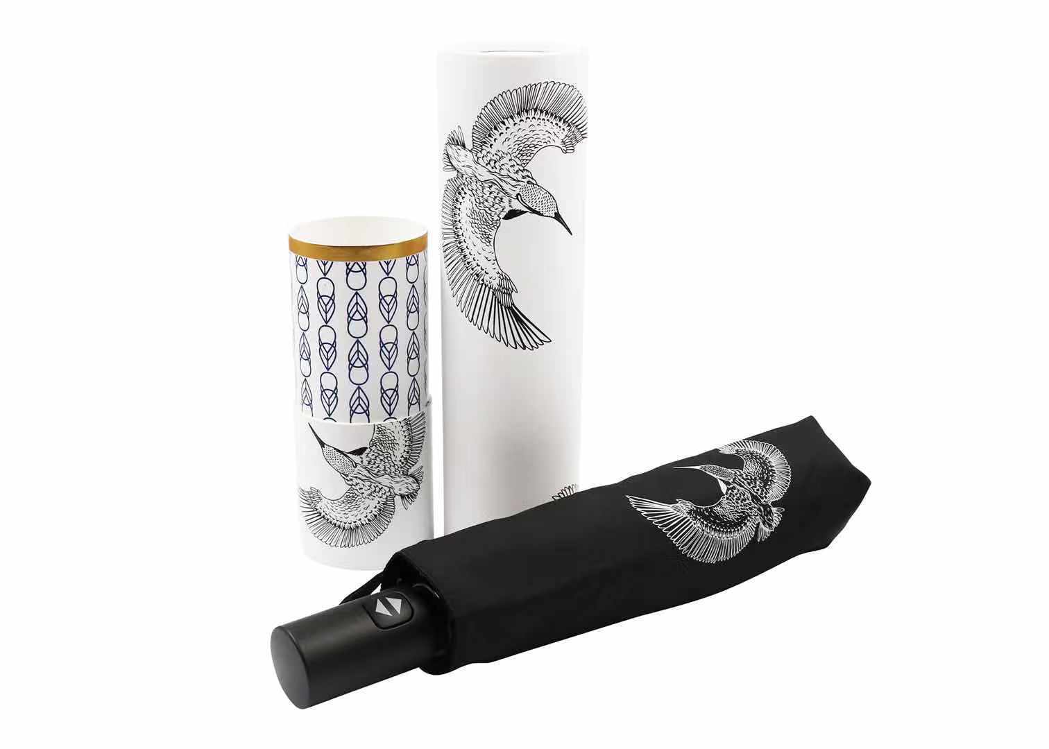 カワセミのワンポイントが入ったこだわりの収納カバー付き。収納口が大きく開きやすい設計になり、収納しやすいです。さらに傘布と同じ素材で設計され、撥水性・耐久性が抜群。傘布に残った水分をしっかり袋内に留めます。白い筒に入れて1つ1つ丁寧にお届けします。