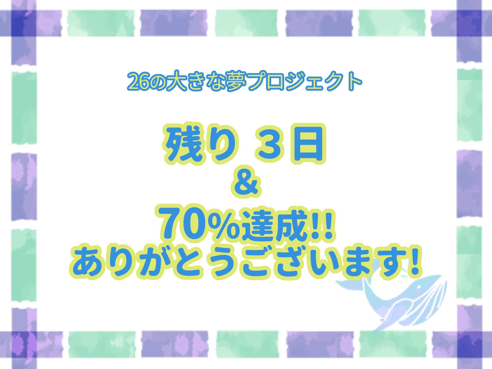 2020/07/25 17:29こんにちは!児童劇団「大きな夢」クラウドファンディングチームです!6月21日からスタートしたプロジェクトもあっという間にひと月が経ち、気が付くと終了まで残り3日となりました。開始初日から支援していただいた方、なかなか動きが少なく苦しい中間期に力強く背中を押してくださった方、皆様に支えていただきながらなんとか終盤までやってくることができました。そしてこの数日間で、、、ついにプロジェクト達成率70%を超えることができました!!ご支援いただいた皆様、本当にありがとうございます。嬉しいのは達成率だけではありません。支援の際に皆様からお寄せいただいたコメントは、チームメンバー一同とても楽しみにしていて、いつも力をいただいていました。本日はほんの一部ですが、応援コメントをご紹介させてください!****☆「大きな夢」の演目はどれも素晴らしく、心を潤してくれます。この苦しい状況が早く収束し、感動の舞台がまた観られますように、微力ながら応援させていただきます。 ☆どんな状況も受け入れて、今だからこそ出来ることにチャレンジする子ども達の姿に、勇気をもらっています。来年また、子ども達が舞台でキラキラ輝けますように! ☆応援しています!どうか子どもたちが輝く舞台の火が消えませんように。 ☆娘を育ててくださった大切な大切な劇団。娘の夢は大きな夢で大きく育ちました。感謝いたします。来年の公演を楽しみにしております。****あたたかい励ましのお言葉や、毎年の公演を楽しみにしてくださっている方。今は大きな夢を離れ、新たな夢に向かって歩みながらも、ずっと応援してくださっている方。全てのコメントが本当に嬉しく、励みになります。残すところ3日間。最後まで全力で「大きな夢」の未来をつなげるために走り抜けます!<26の大きな夢・いよいよラストスパート!>https://youtu.be/1TAtHzDe6GI最終日まであたたかく見守り、そして応援していただけますと幸いです。 もっと見る