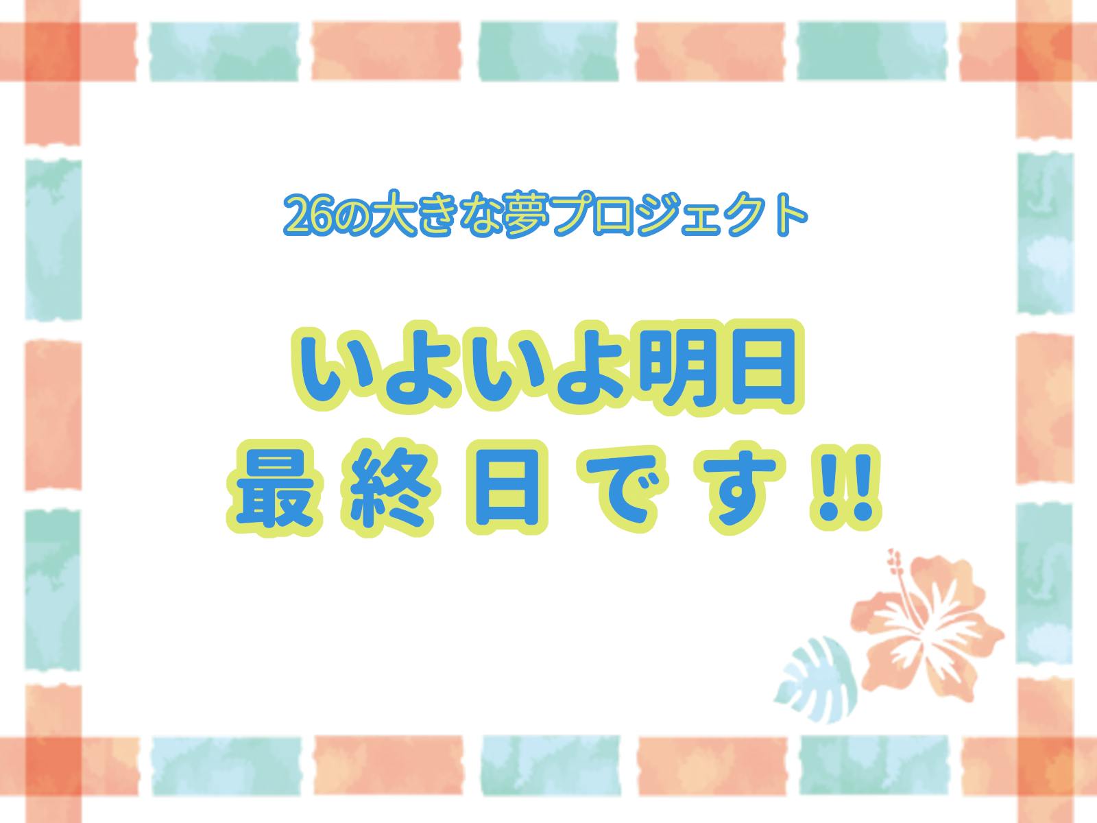 2020/07/27 18:25こんにちは!児童劇団「大きな夢」クラウドファンディングチームです。7月の大型連休が過ぎいよいよ、、、「届けミュージカル!全国26ヶ所、子ども達のステージを再び」プロジェクト残り 1日となりました。本当にありがたいことに、どんどんと支援の輪が広がっていき、1週間前は達成率50%ちょっとだったのが、今では80%が目前。ついに、目標金額まで100万円をきることができました!!ご支援いただいた皆様、そしてさらに支援の輪を広げようと尽力いただいた皆様、達成率の推移をずっと見守ってくださった方。関わってくださった全ての皆様へ、心より感謝申し上げます。とは言え、まだあと1日!少しでも目標金額に近づくことができるように最後まで頑張ります!私達の周りには「大きな夢」をもったたくさんの子ども達がいます。コロナで公演ができずとも、次を見据え、今を笑顔で乗り越えようとしている心強い仲間でもあります。その子ども達の想いや夢を、私達はなんとしてでも繋いでいかなければなりません。来年こそ劇場で、ミュージカルが大好きな子ども達が「大きな夢」を抱きながら輝く舞台をお届けできるように。どうか、最後まで応援していただけますと幸いです。 もっと見る