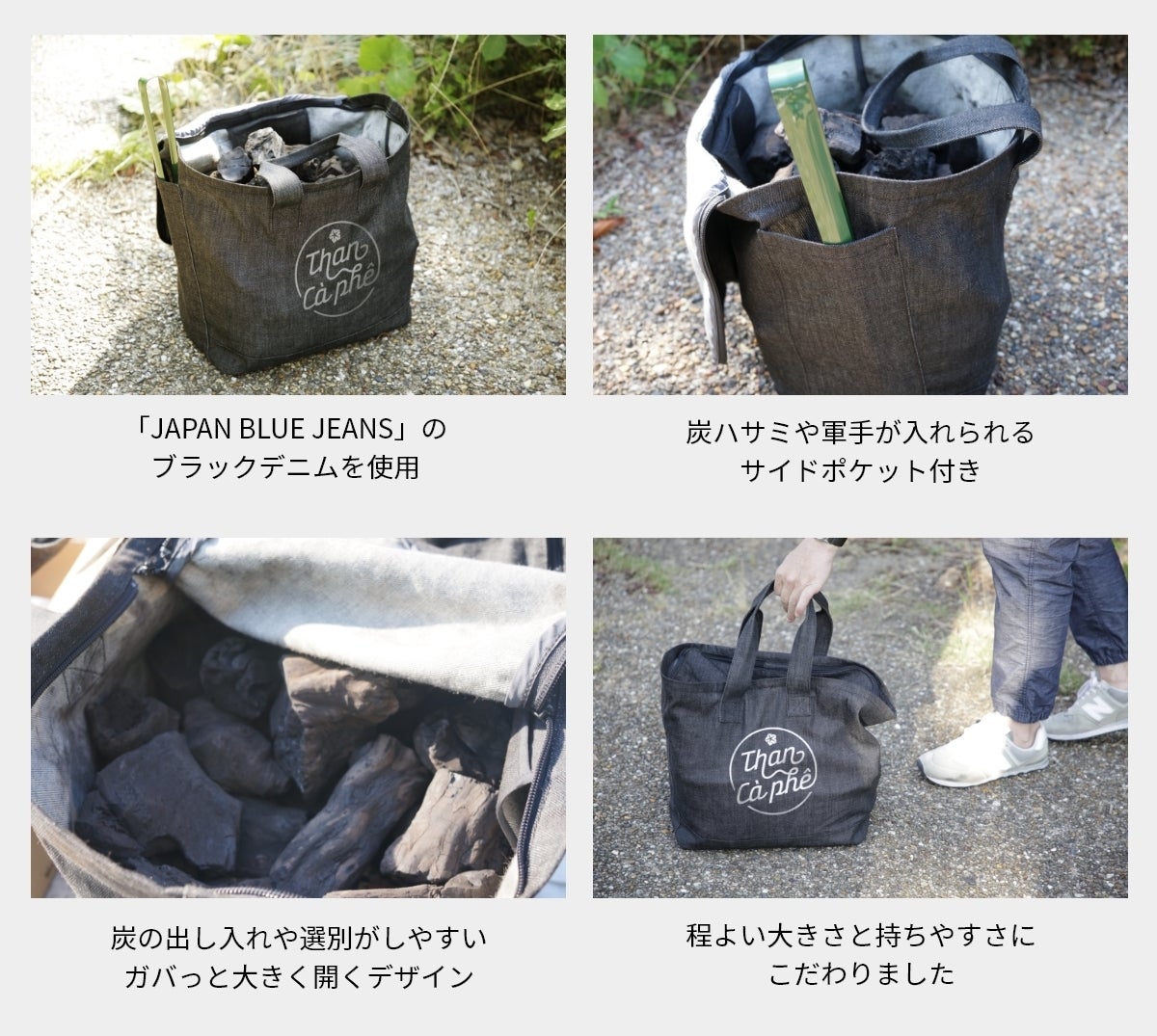 バッグは日本が誇るデニムの産地、倉敷市児島発祥のデニムブランド「JAPAN BLUE JEANS」のブラックデニムを使用。炭の出し入れがしやすいように大きく口が開くデザインで、しっかりと蓋ができるので移動時に服や車内が汚れにくいよう配慮されています。
