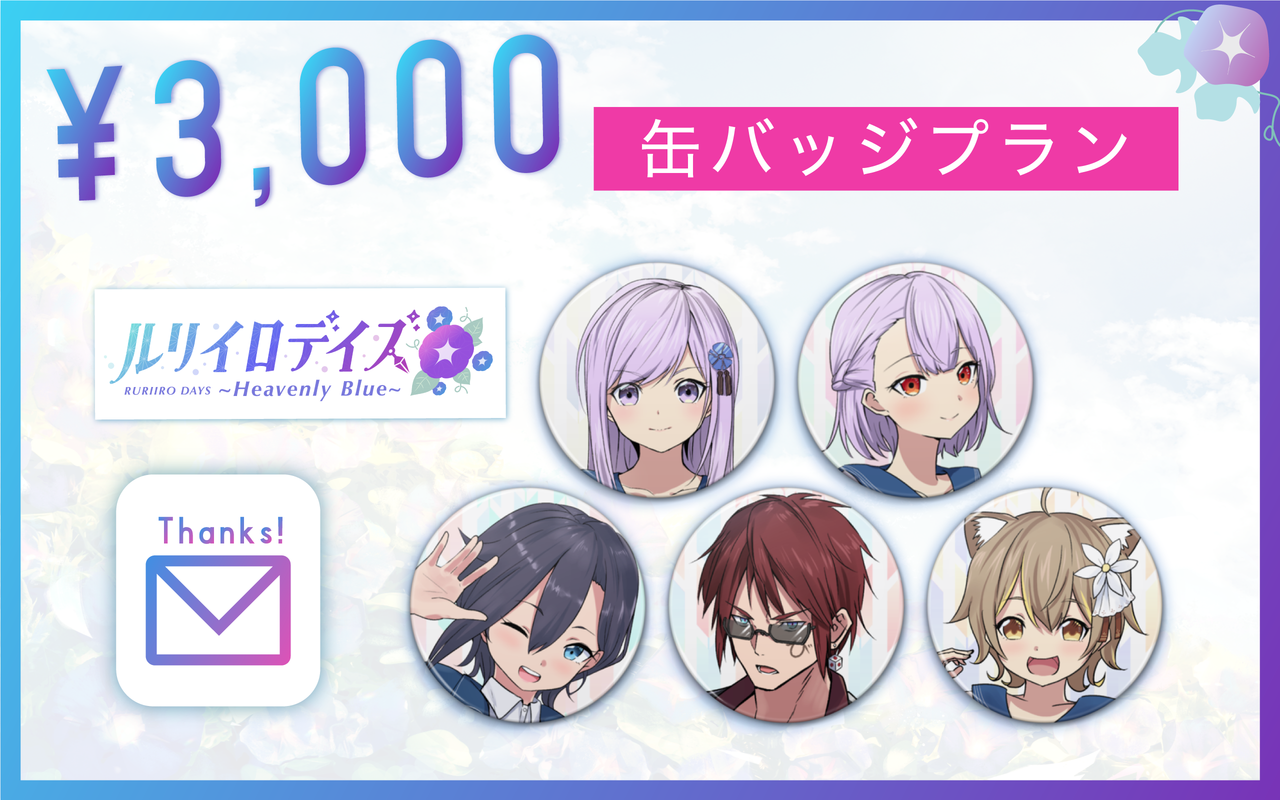 →『ルリイロデイズ』に出演するVTuberの方々5名のオリジナル缶バッジをお送りいたします