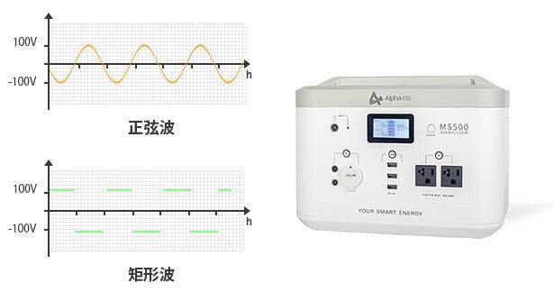 正弦波(せいげんは)と矩形波(くけいは)です。MINI SMILEは正弦波を採用し、家庭用100Vコンセントと同じ波形ですので、精密機器の利用など問題なくご利用いただけます。