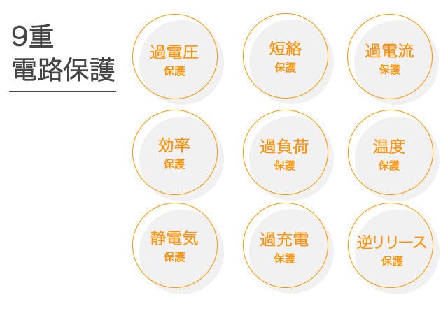 BMS(バッテリー管理システム)により、出力過電流保護、入出力過電圧保護、出力低電圧保護、過熱保護、短絡保護の機能でバッテリーを守ります。