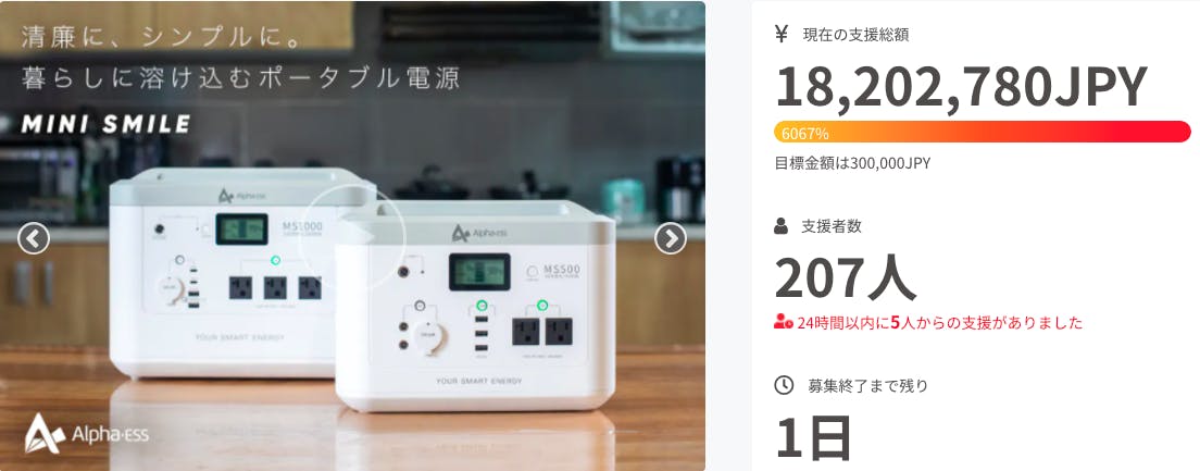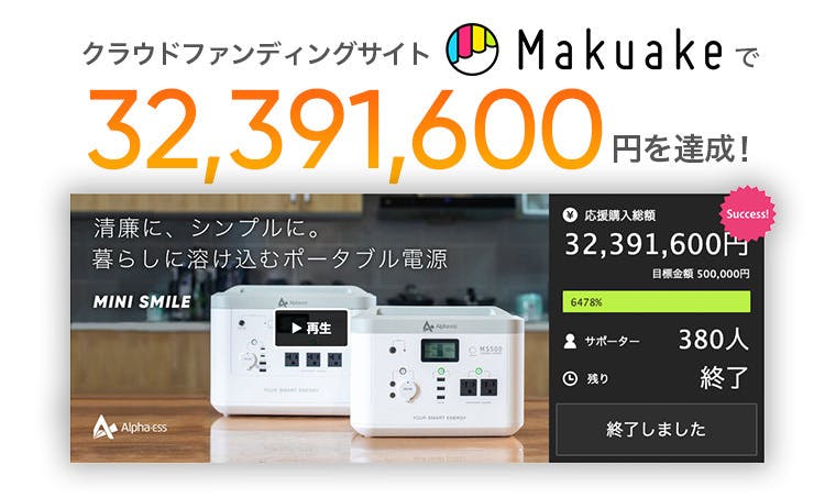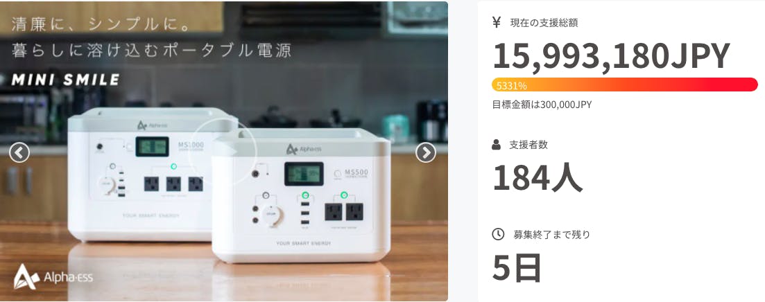 2021/11/24 20:41227名の支援者の皆様、本プロジェクトを応援頂き有難うございました!最後の駆け込みもあり、2000万円以上の支援金額で目標大幅達成となりました。スタッフ一同大変嬉しく思っております。さて、早速ですがご連絡があります。①配送日程についてすでに配送の手続きは進んでおり、明日より順次配送が開始されます。商品が届きましたら、商品の動作確認などをお願いします。※ポータブル電源+ソーラーパネルのセットをご購入された方は、同時に商品が到着しない場合がございます。(物流会社との契約上、伝票番号が分かれてしまうため)1商品しか届かない場合でも、もう一方の商品を1日ほどお待ちいただき、問題がございましたらご連絡ください。②保証の開始日について今回クラウドファンディングの特性上、注文日と配送日に空きが生じてしまいます。この事を考慮し、今回特別に保証開始日はポータブル電源、ソーラーパネル両方で実際の倉庫出荷日を保証開始日とさせていただきます。(ポータブル電源及び、ソーラーパネルのそれぞれのお客様の出荷日はこちらでデータで管理させて頂いております)③パネルの保証書には、製造メーカー出荷日(2021年4月、弊社がメーカーに発注&出荷依頼をしたタイミング)が記載されていますが、こちらは製造メーカーが誤って記載したものの為、実際の保証開始日は上記②の通りになります。保証開始日(2021年4月)が記載されていたとしても、商品は返品されたものではなく新品で、さらに保証開始日も弊社でデータで管理されていますのでご安心ください。何かお困りのことがあれば、下記の連絡先までご連絡ください。AlphaESS商品についてのお問い合わせ先(日本語対応)メールアドレス:alphaess.jp@alpha-ess.com電話番号:03-3248-1518営業時間:平日9:00〜17:00 もっと見る