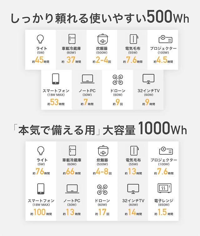 今回ご用意したのは2タイプ。使いやすく初心者にもおすすめの500Wh。大容量で災害時にもしっかり頼れる1000Wh。使い方にあわせてお選びください!