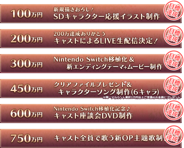 100万達成で「新規描きおろしSD応援イラスト制作」、200万達成で「キャストによるライブ生配信」 、そして最終目標にはもっともっと沢山の人にプレイして欲しいという思いを込め、Nintendo Switch版への移植化を掲げております!