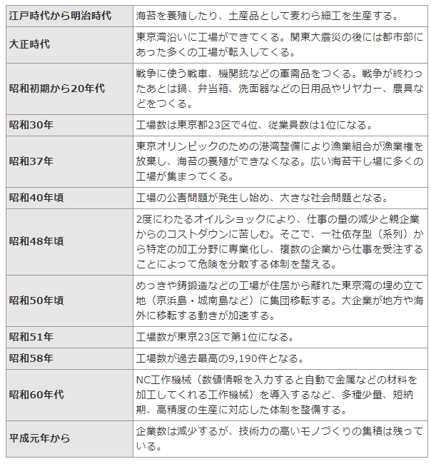 大田区の工業は、製造業事業所数と従業員数、従業員4人以上の事業所における製造品出荷額について、東京都特別区中第1位となっております。