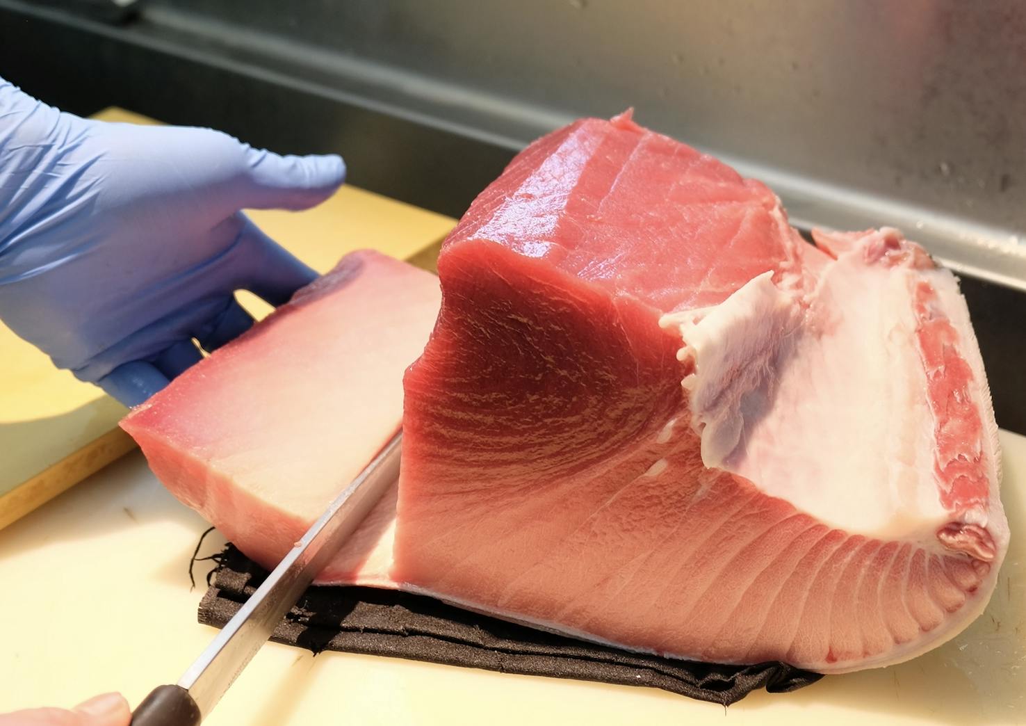 美味しいまぐろの見分け方は、先代から受け継いだ大切な技術。確かな目利きと長年培った熟練の勘で、漁港に揚がった大量のまぐろから、良質なまぐろのみを選んで買い付けています。