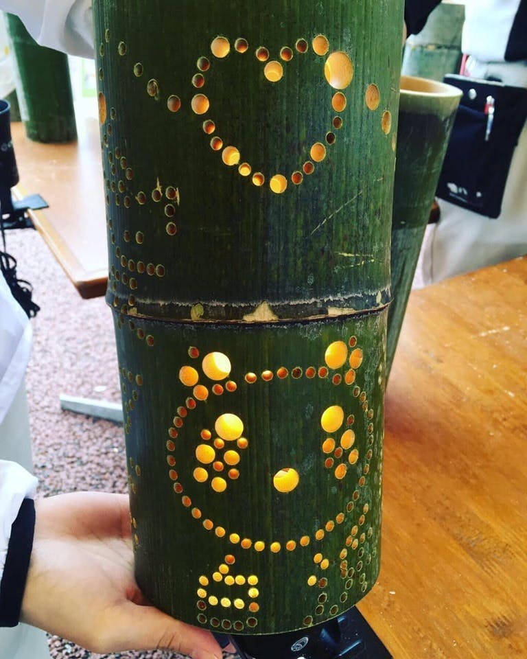力のある大人達に竹を切ってもらい、ワークショップで専用のドリルを使いながら大小さまざまな大きさの穴を開けて、竹あかりを作成。