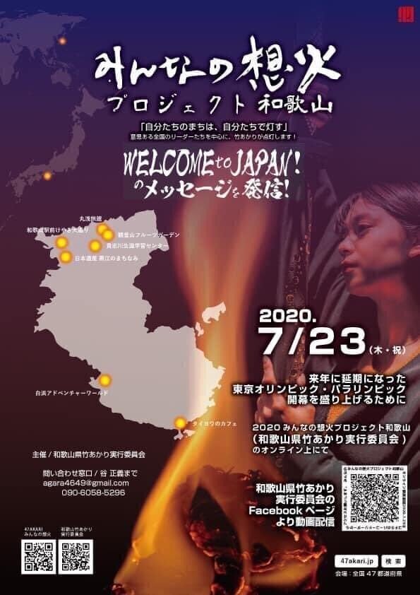 連日のコロナウイルスに関するニュースに、各地で様々な混乱が広がっているのを感じます。この状況の中、私たちも改めて深く深く考えさせられました。「7月23日、私たちはなんのために、誰のために竹あかりを灯すんだろう?」“竹あかり” は明日を照らす想いの火(あかり)。どんな状況にあっても、明るい未来を願い、誰かを想う人の手で作られる、そんな心に灯りを燈してくれるものだと思っています。「だったら、こんな時だからこそ私たちは竹あかりを灯さなくちゃ!」これが私たちのひとつの答えです。「自分たちのまちは自分たちで灯す」繰り返し繰り返し、みんなの想火プロジェクトで唱えているこの言葉。そんな意志を持った全国47都道府県のリーダー達が集まってる私たち。そして沢山の応援してくださっている大好きな仲間たち。 コロナの影響で2020 7月24日、東京オリンピックが来年7月23日に延期になりましたが私たちはそれでも竹あかりを灯します。規模は小さくなってもオンラインになってもいい。それでも みんな それぞれの 愛する場所に あかり を ともし、そんなリーダーが 日本の中にいるという事を日本中、世界中のみんなに知ってもらいたい。それこそが 沢山の人の 勇気と希望に繫がる と 思うから。こんなときだからこそ、知恵を振り絞って工夫しながら、自分の意志で想いの火を消さずに頑張ります!!今、この文章を読んでくださっている和歌山県、全国、世界の皆さん!一緒に和歌山、日本を燈しましょう!世界にコロナに負けるな!コロナに打ち勝とう!和歌山はコロナに負けないぞ!とのメッセージを伝えましょうー!!ひとりでも多くの人に知っていただけますように!!みなさま応援、よろしくお願いします!!そして、新型コロナウイルス感染症が一刻も早く終息し、安心して外出ができる時期に参りましたら、是非、みんなで一生懸命制作した現物のみんなの想火プロジェクトの竹あかりを皆さまにご覧いただきたいです。今は、ステイホーム、エンジョイホームで今を共に乗り越えましょう!本日は、ありがとうございました!