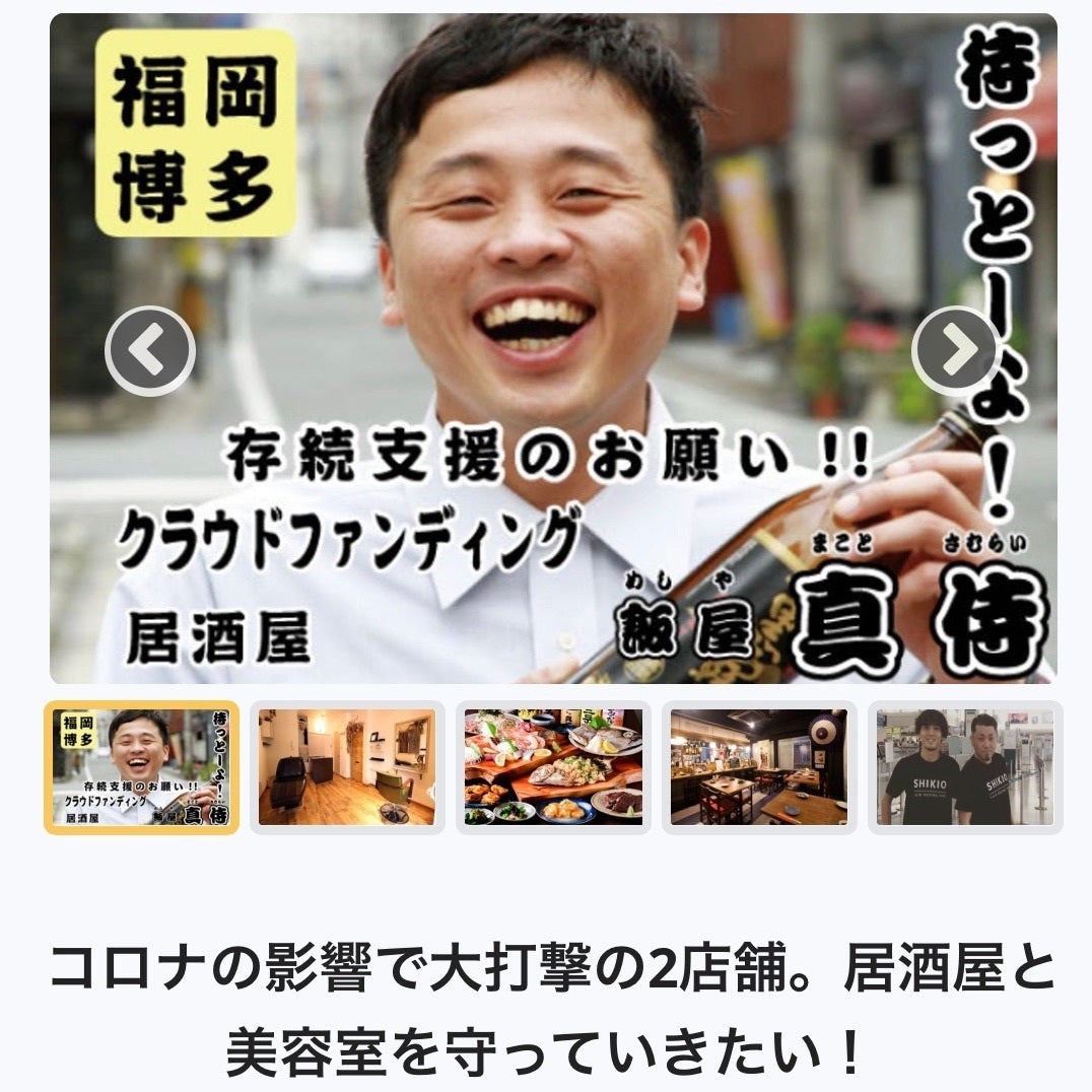 2020/05/26 12:00真侍を支え続けてきてくれたスタッフの活躍できるステージとして博多に2019年の9月居酒屋の2号店として 博多 真侍 酒場を出店しました。今回のクラウドファンディングをはじめた目的はお店の存続、スタッフの雇用を守り続けること。沢山の温かいメッセージ、ご支援頂いた恩を無駄にはできません。スタッフ達とも話し合いを重ね出した答えは、博多のお店を閉め大名のお店をスタッフ一丸となって守り続ける事が、皆さまの恩返しに繋がると信じています。契約上10月いっぱいまで営業は続けないといけませんので最後の最後まで、お客様に喜んで頂けるように頑張りますのでよろしくお願い致します。 もっと見る