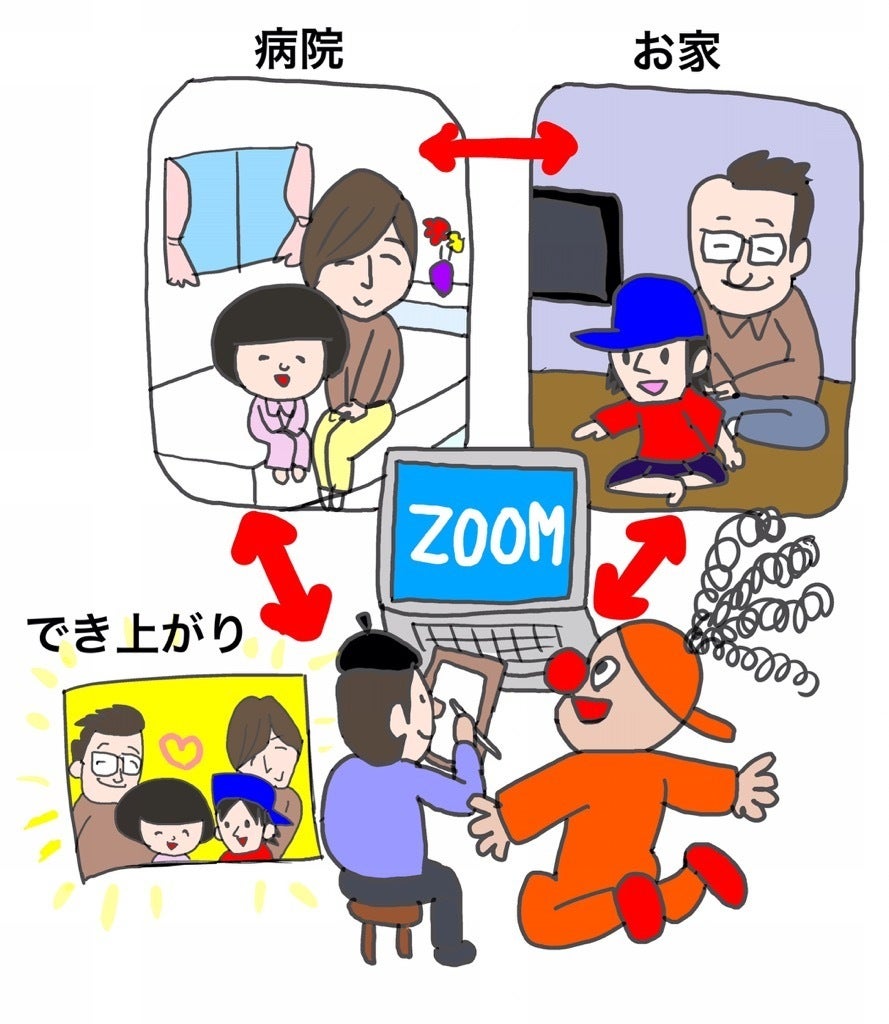家族とも会えず不安を抱えながら病室で過ごす子ども達に、少しでも家族と一緒に居るような時間を過ごしてもらいたい。オンライン会議用ツールを使い、家族みんなでクラウンのパフォーマンスを観て、家族みんなで笑って過ごしてもらいたい。その一緒に笑っている姿を1枚の似顔絵にして飾ってもらい、また一緒に笑える日を迎えてほしい。こんなクラウンの思いからこのプロジェクトが始まりました。