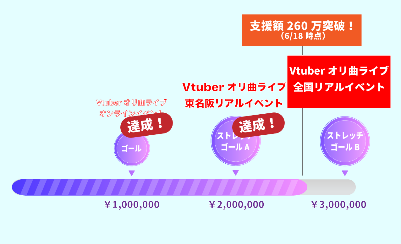 目標金額300%達成により、現在は東京・名古屋・大阪+3箇所でのリアルライブイベントが開催可能になっております。