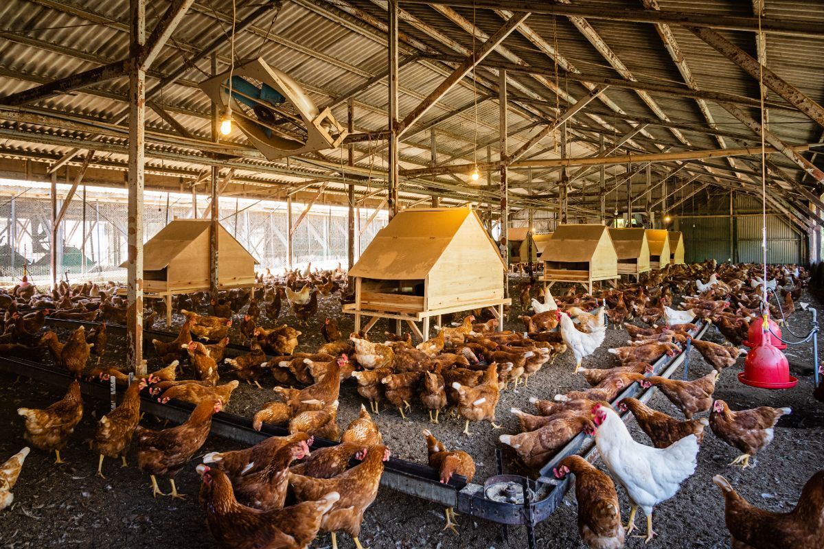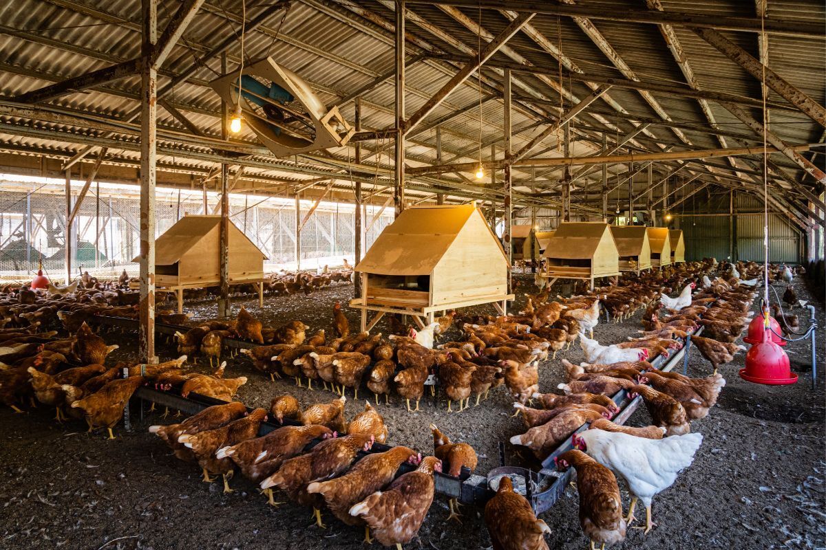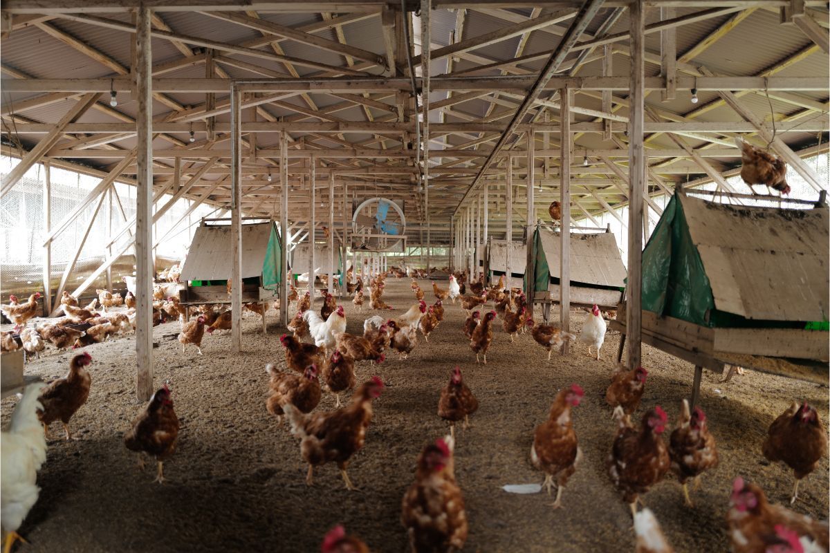 広い鶏舎の中にいるのは茶色のメス鷄670羽と、一回り大きい白い雄鷄30羽がおり、複数の鶏舎を合わせて約1300羽の鶏がおり、毎日1200個の卵を生みます。