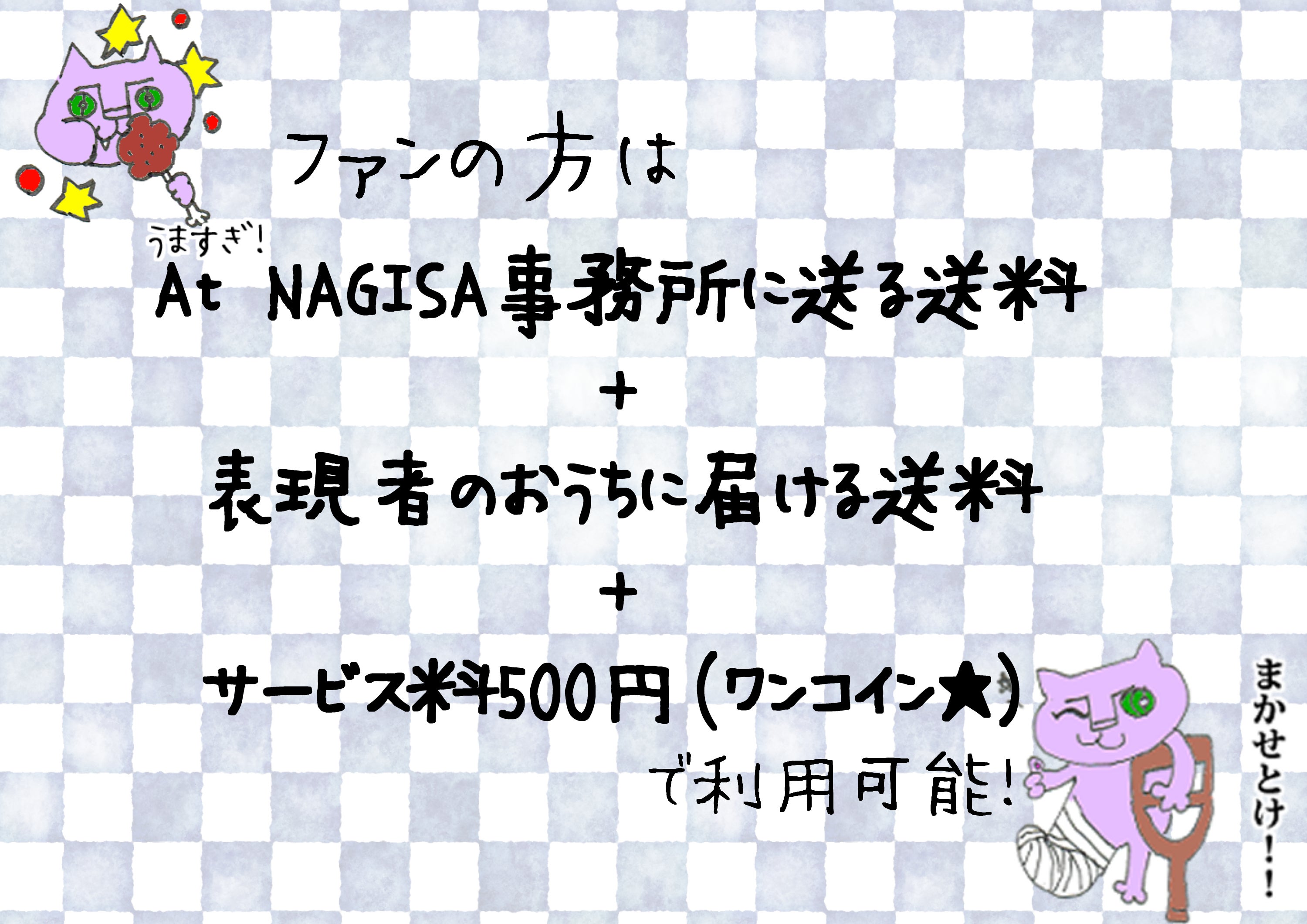 リスナー様にはAt NAGISA事務所への送料、At NAGISA事務所から配信者様へ送る送料+サービス料500円で利用出来ます。