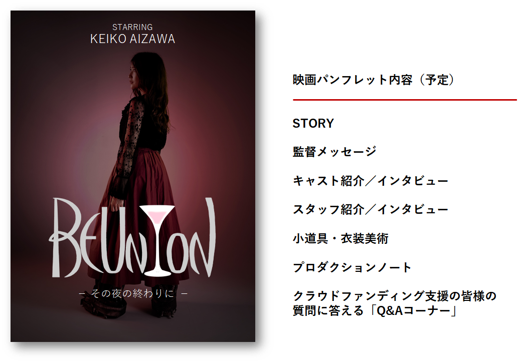 監督やキャストと一緒に映画の感想で盛り上がれる「完成記念ツイキャス」はBコース以上につきます。主演の藍澤慶子さんほか、主要キャストが参加予定です。Cコース以上につく映画パンフレットは、クラウドファンディング~本編制作期間中に寄せられた質問に答える「Q&Aコーナー」も充実!