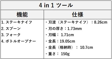 コンパクトなデザインながら、フルサイズのスプーン、ステーキナイフ、フォークを備えています。