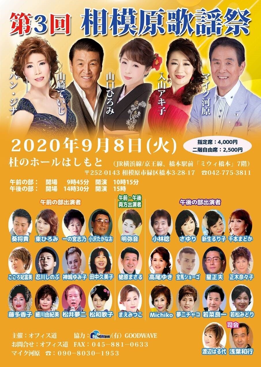 この「横浜、相模原で歌謡祭を開催の「オフィス道」と歌手・マイク河原を助けて下さい!」をご覧いただき誠に有難うございました。
